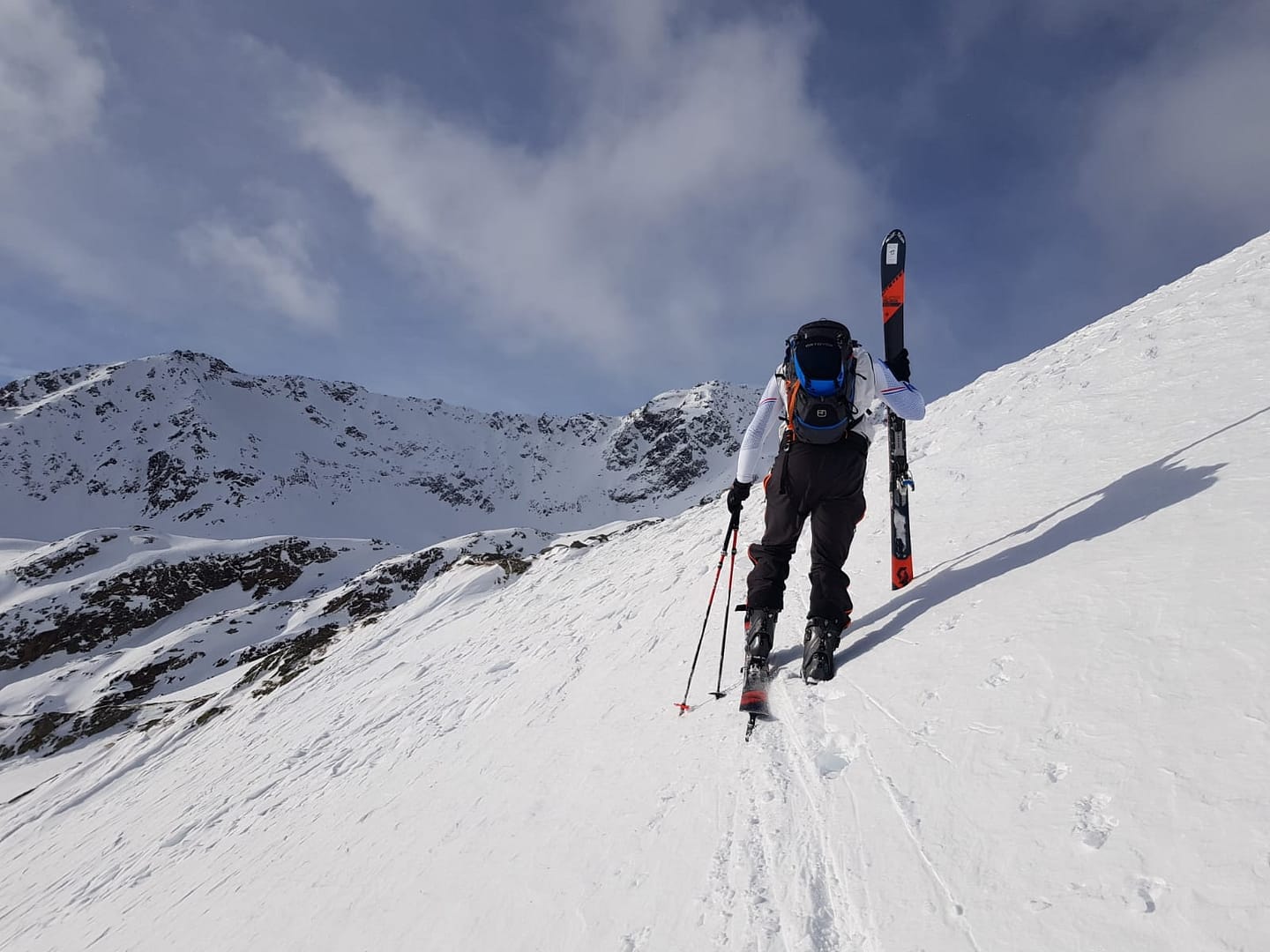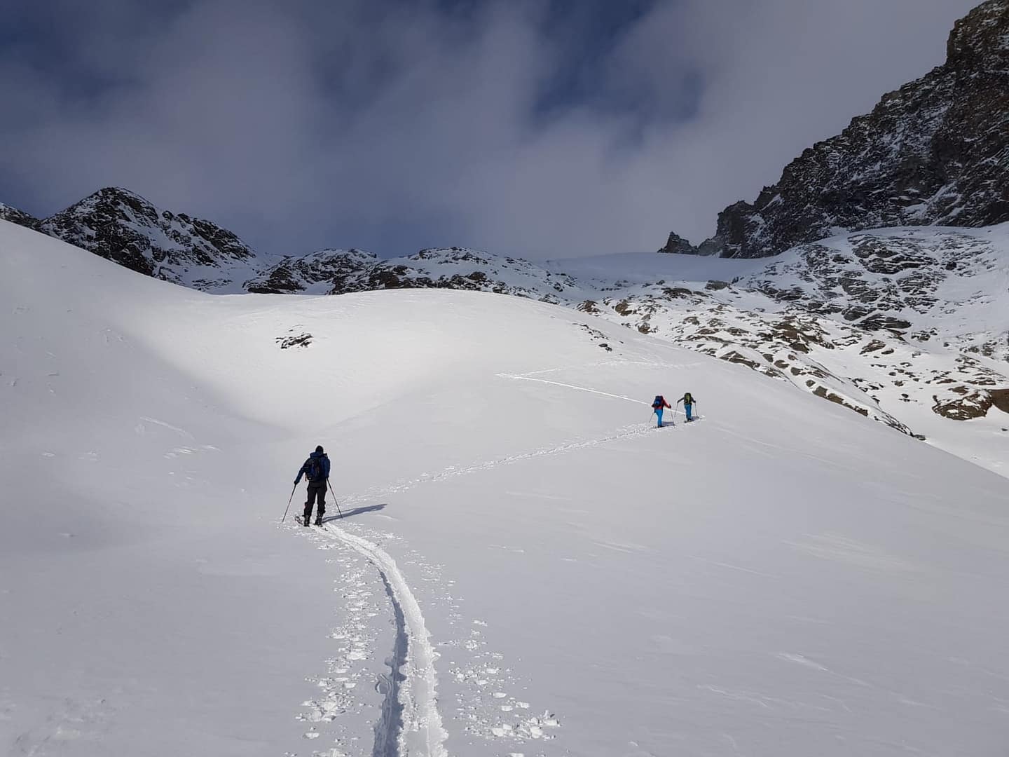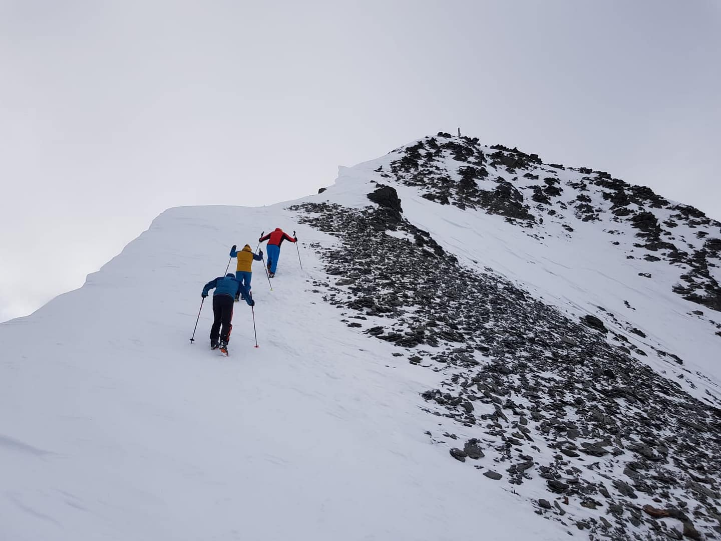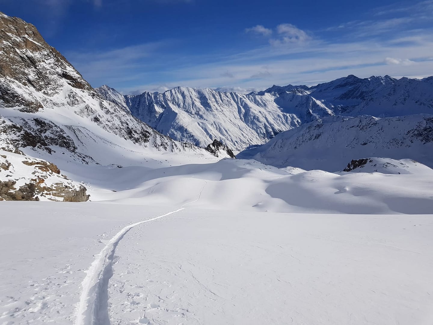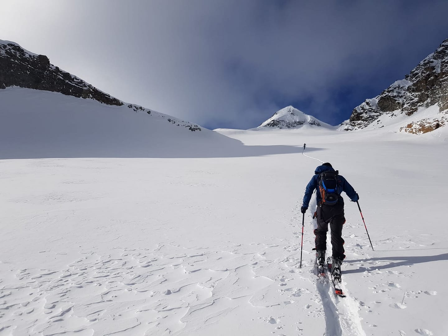 „Oben“ angekommen wird das Tal breiter und die weißen Hänge begrüßen uns bereits. In der Ferne sieht man bereits unser Ziel den Gipfel vom K2. Zuerst müssen wir aber noch durch eine Mulde hindurch und gelangen in den breiten Auslauf des Löcherfernes. Wir steuern die Schwarte zwischen dem K2 und dem Rositzkogel an, denn dort machen wir ein Skidepot. Der Nordgrat war sehr eisig und abgeblasen, bei sehr schlechten Bedingungen sind hier Steigeisen oder ähnliches sinnvoll.