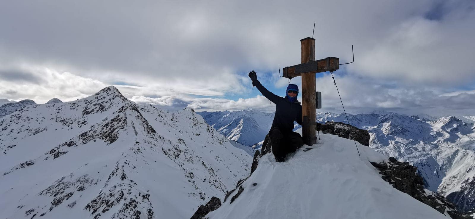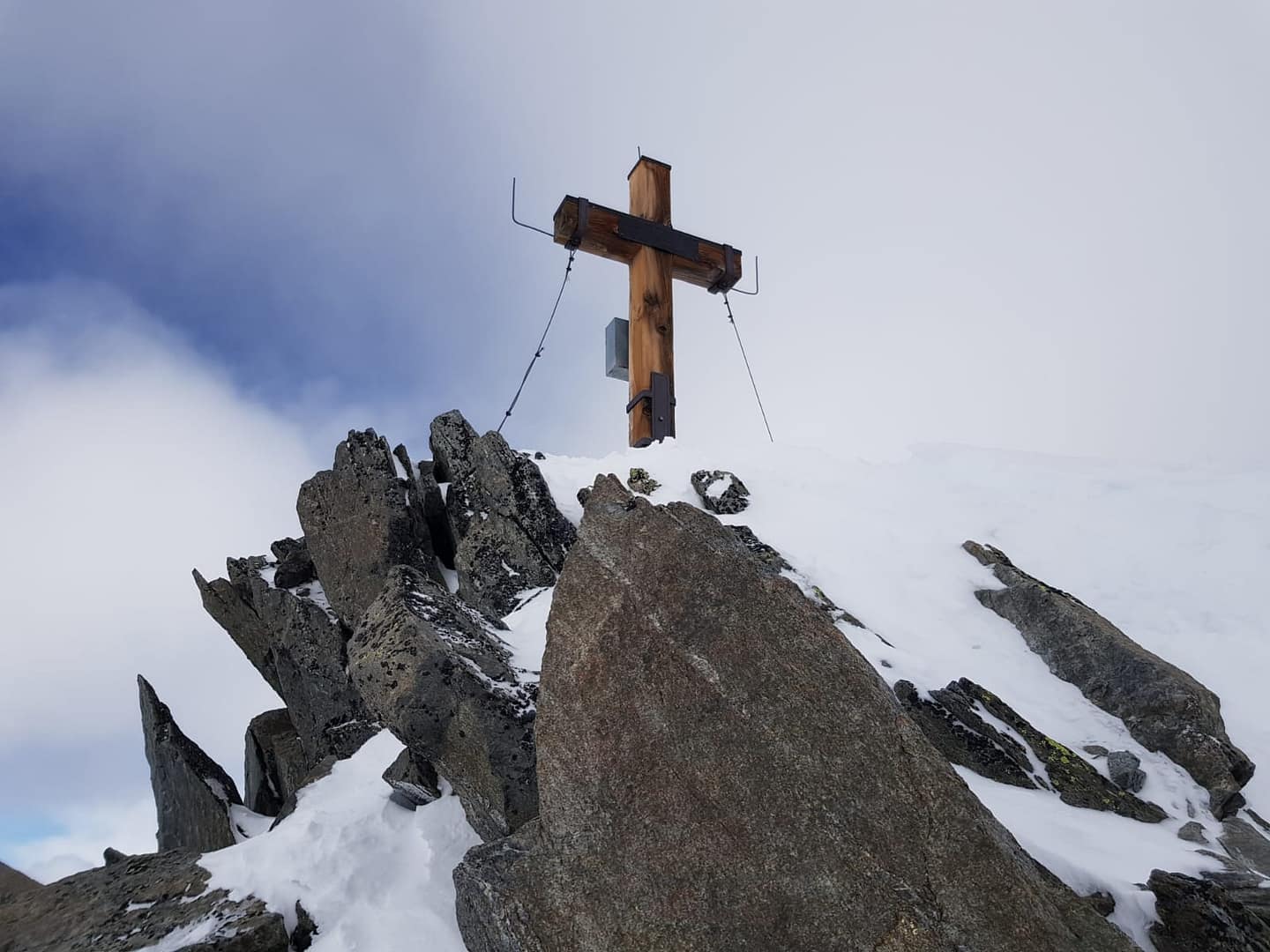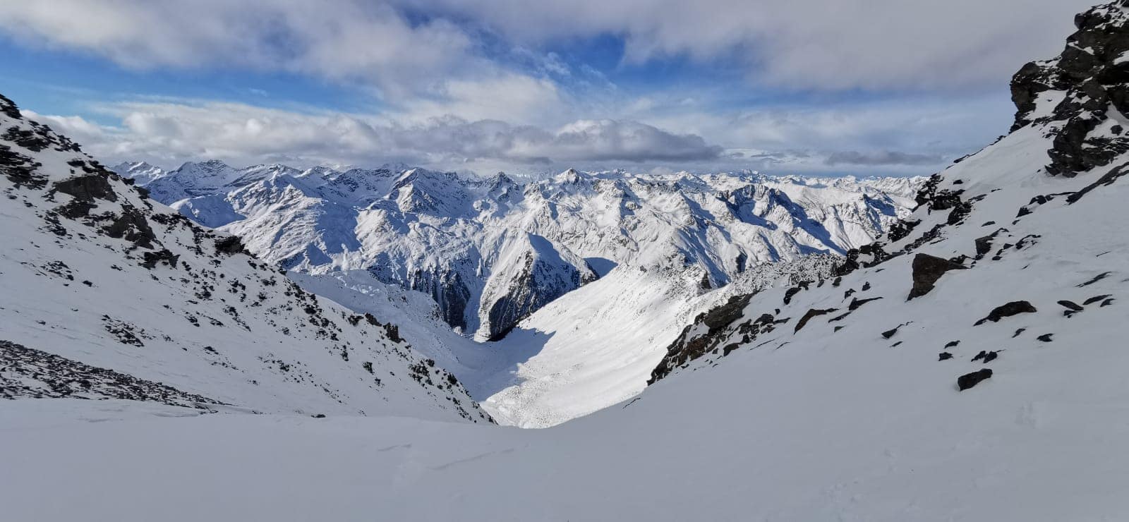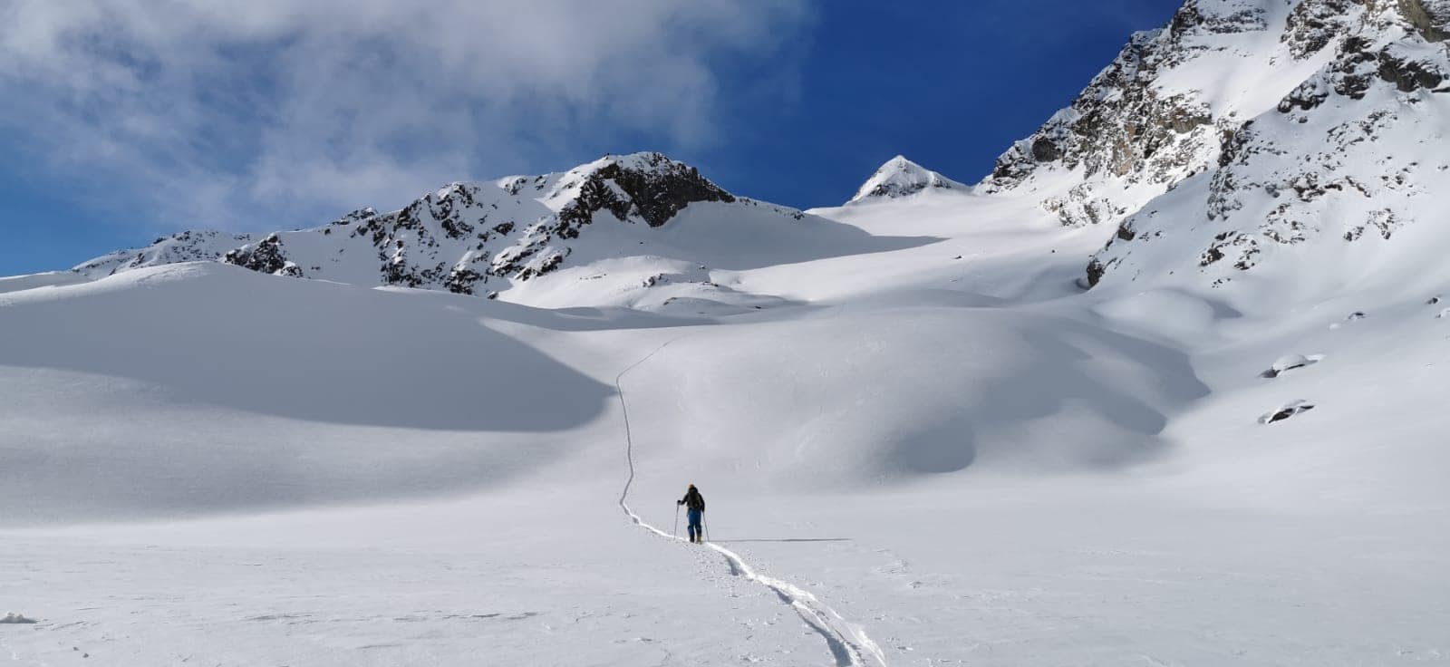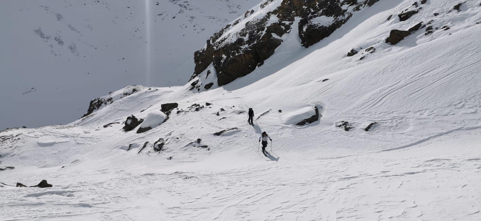 „Oben“ angekommen wird das Tal breiter und die weißen Hänge begrüßen uns bereits. In der Ferne sieht man bereits unser Ziel den Gipfel vom K2. Zuerst müssen wir aber noch durch eine Mulde hindurch und gelangen in den breiten Auslauf des Löcherfernes. Wir steuern die Schwarte zwischen dem K2 und dem Rositzkogel an, denn dort machen wir ein Skidepot. Der Nordgrat war sehr eisig und abgeblasen, bei sehr schlechten Bedingungen sind hier Steigeisen oder ähnliches sinnvoll.