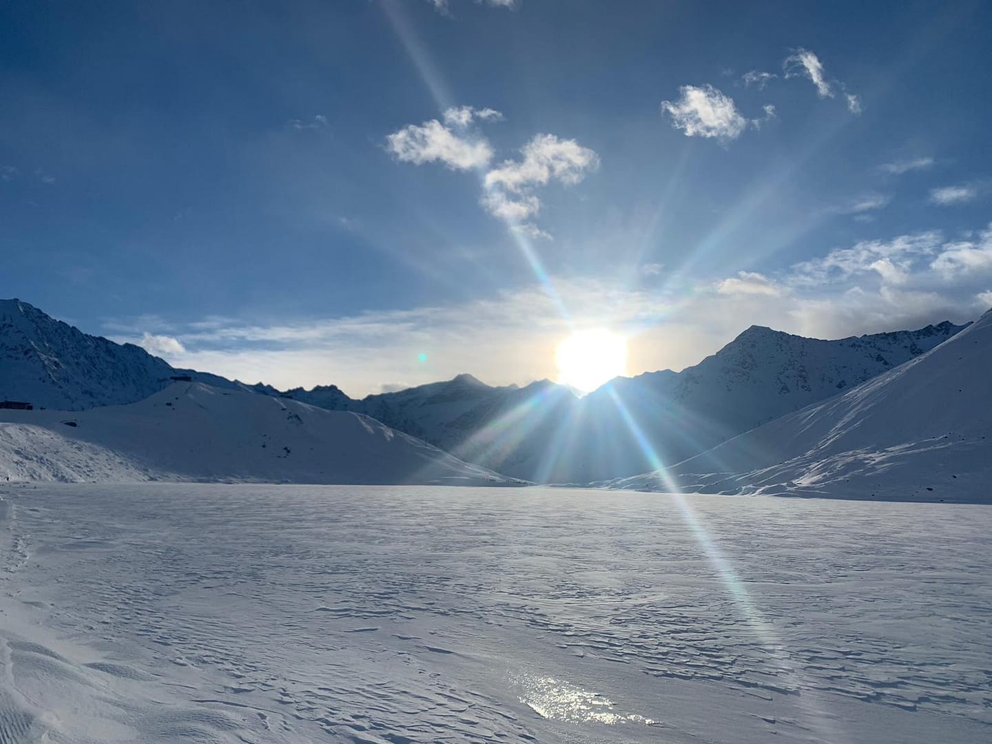 Die Abfahrt führt im Grunde entlang der Aufstiegsroute zurück an den See, wo wir uns aber entgegen dem Aufstieg auf der anderen Seeseite befinden und dort bis zur Piste gehen. Wir haben am See noch einmal umgefellt, gerade für die Splitboarder unter uns sinnvoll 😉 Auf der Piste ging es dann zurück ins Tal nach Mandarfen.