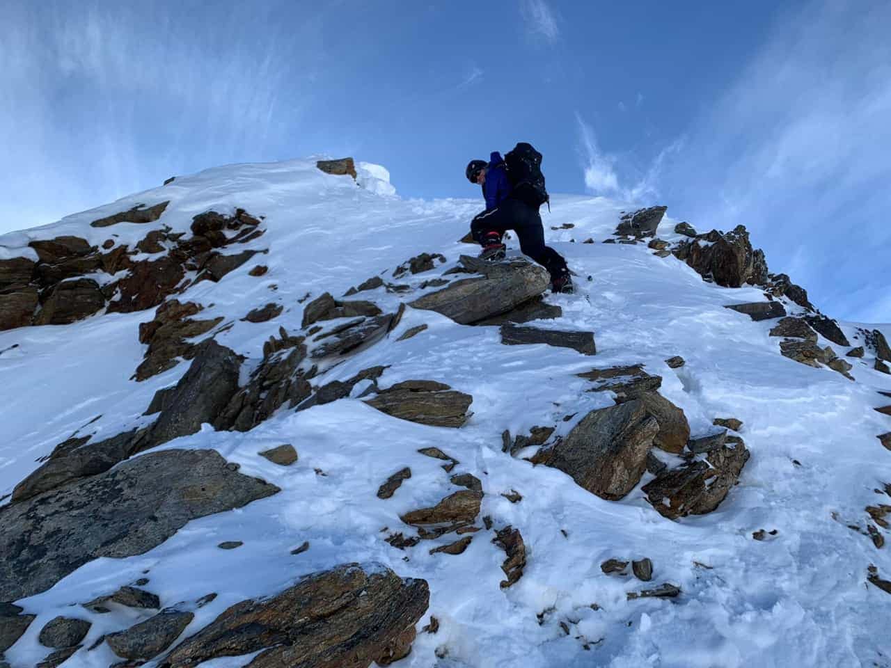 Auf halbem Weg vom Grat haben 2 von 3 den Weg abgebrochen und dort einfach die Aussicht genossen, der Rest vom Grat, der teilweise über 40° hat, war überwechtet und sah nicht so einladend aus mit dem brüchigen Felsen.