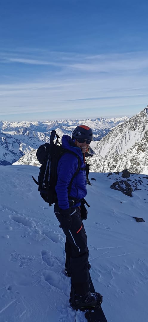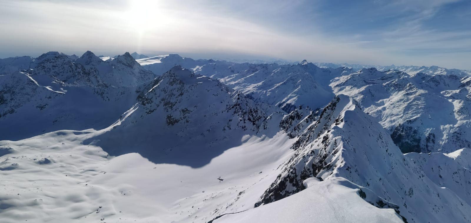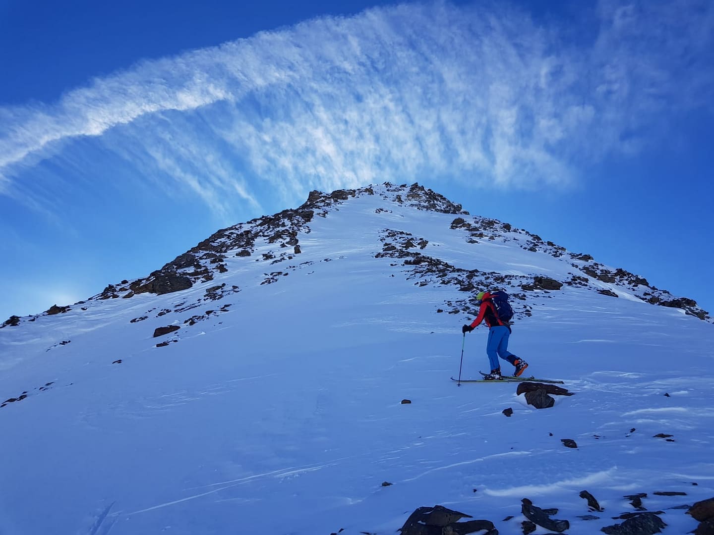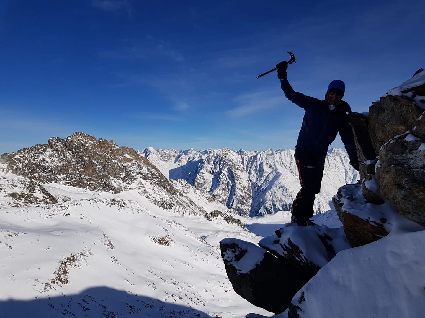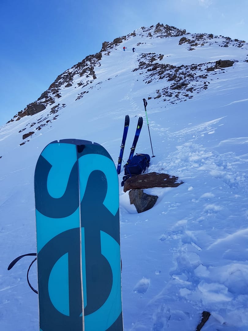 Ich denke, dass man den Gipfel ein Kar weiter besser besteigen kann, wir haben uns ein bisschen „verlaufen“. Beim Skidepot haben wir uns die Steigeisen angezogen sowie den Pickel geschnappt und sind entlang des Grats aufgestiegen. Das erste Stück war eisig mit Harschdeckel und somit recht gut zu gehen, das nächste Stück war dann felsdurchsetzt und leider sehr brüchig, das letzte Stück, welches wir rauf sind, war der Schnee pulverweich, wo wir stark eingesunken sind – von allem etwas.