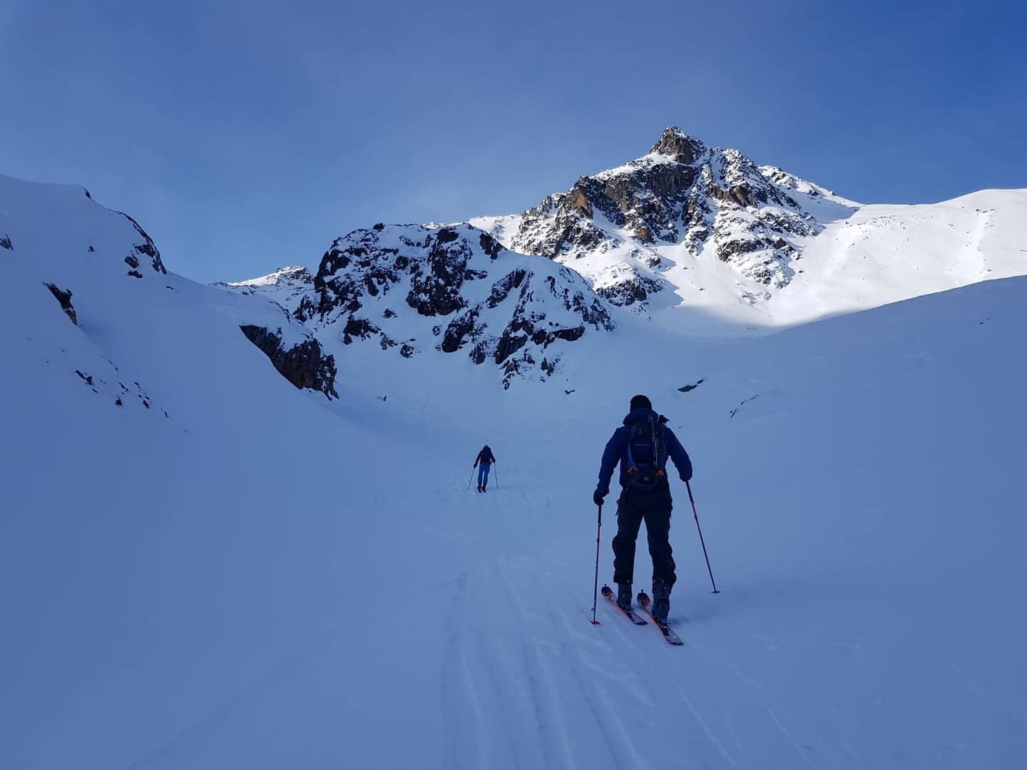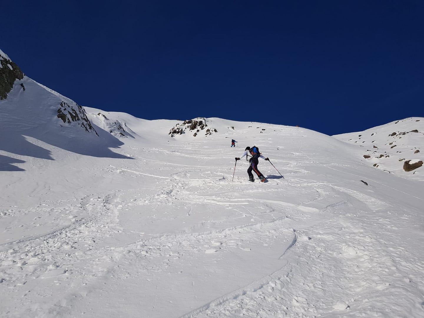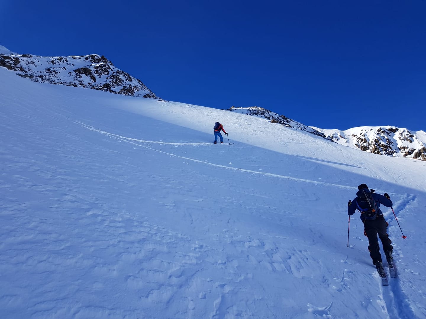 Wir starten (wie auch schon bei der K2-Skitour) oben bei der Bergstation und fahren erst einmal die paar Höhenmeter zum Riffelsee ab. Erst unten fellen wir auf und gehen rechts am See entlang bis zum Ende, dort halten wir uns links und folgen den Weg Richtung Westen in den Talboden hinein. Nach der ersten Geländestufe zweigt der Weg Richtung K2 nach rechts ab, wir jedoch gehen weiter durch das Tal und zweigen erst im nächste Kar nach rechts ab.Den Hang, den wir dort aufsteigen, hat teilweise 35° und sollte bei guten Bedingungen leicht zu bewältigen sein.