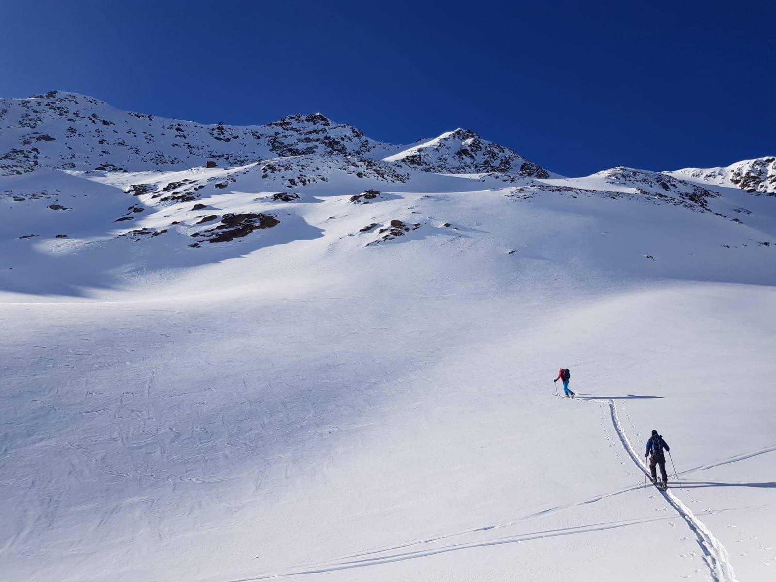 Das uns dort erstreckende Gebiet wird weitläufiger und flacher, auch sehen wir keine Aufstiegsspuren die zum Löcherkogel raufführen, lediglich sind vereinzelte Abfahrtsspuren vom K2 zu sehen. Wir halten auf das Rostizjoch zu und queren zu guter Letzt links die Hänge bis zum Skidepot rauf.