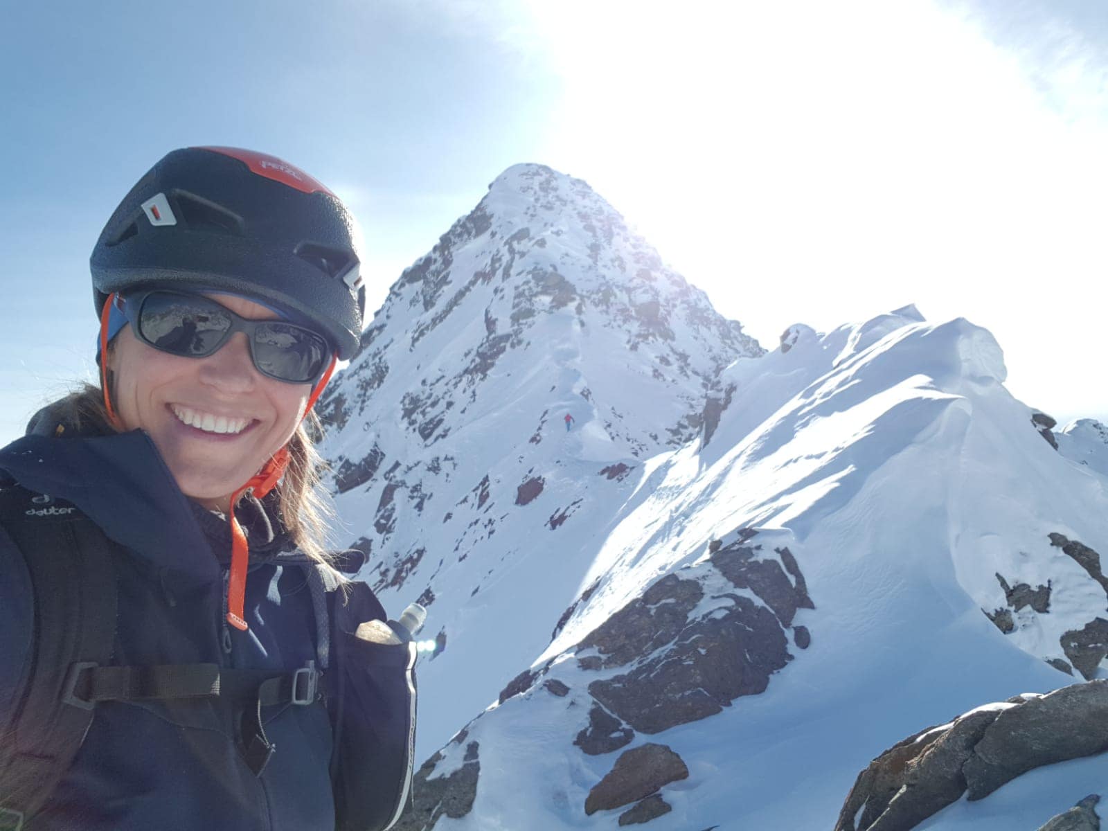 Auf halbem Weg vom Grat haben 2 von 3 den Weg abgebrochen und dort einfach die Aussicht genossen, der Rest vom Grat, der teilweise über 40° hat, war überwechtet und sah nicht so einladend aus mit dem brüchigen Felsen.