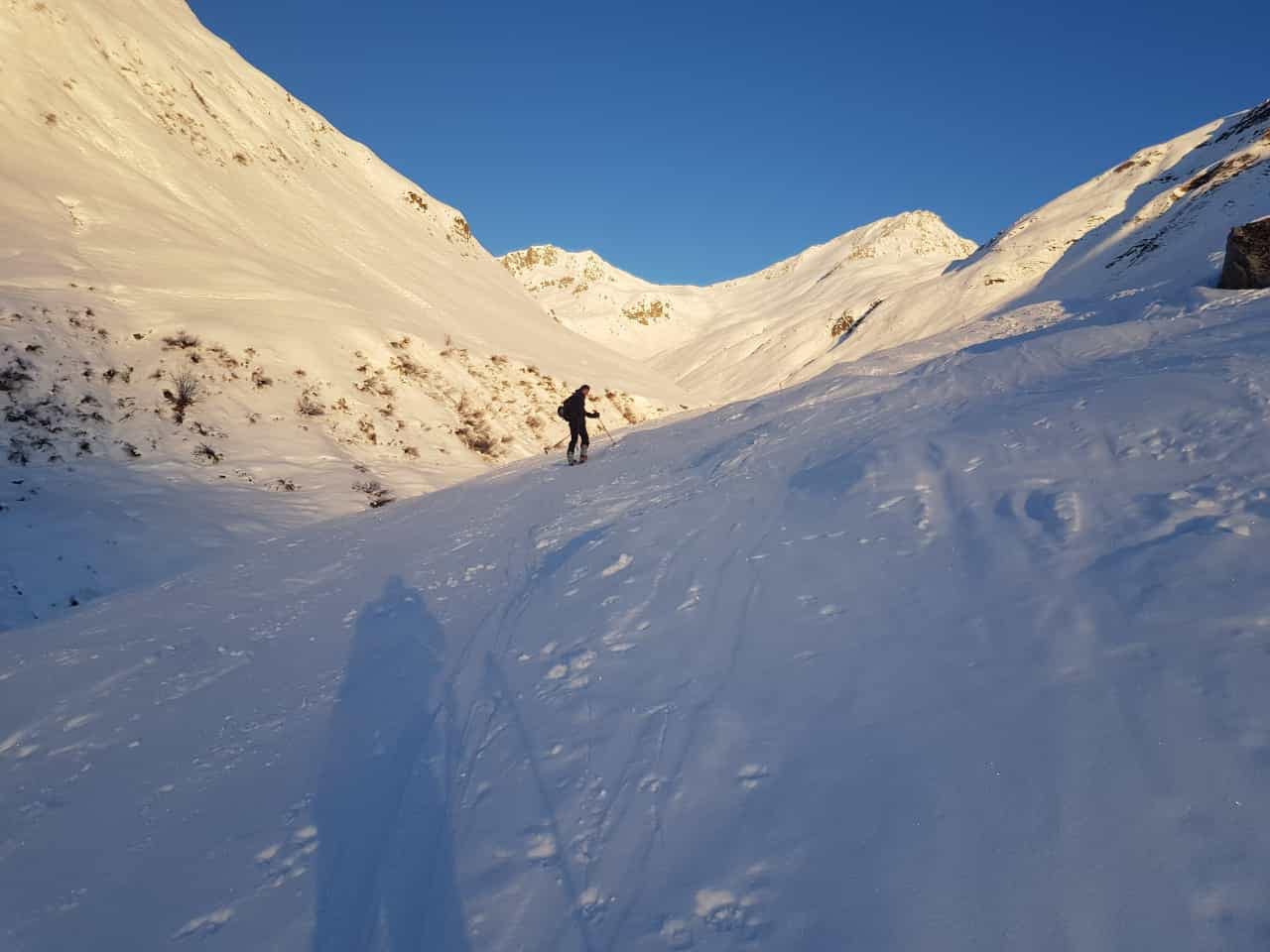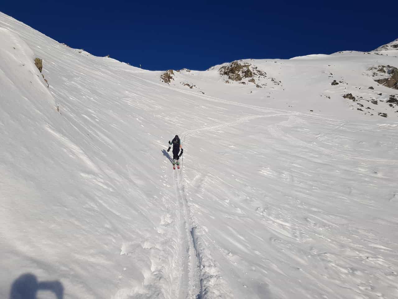 Abfahren kann man entlang des Aufstiegwegs, erleichtert auch die Überquerung vom Bach unten. Wir sind allerdings unterhalb vom Gipfel schräg nach Süden zum Hochalter gefahren und haben dort die langen Osthänge mitgenommen. Die Überquerung des Baches war leider nicht so angenehm, stattdessen hätten wir auch weiter rechts vom Bach abfahren können, aber aufgrund der Parksituation haben wir uns gedacht, wäre der linke Weg besser.