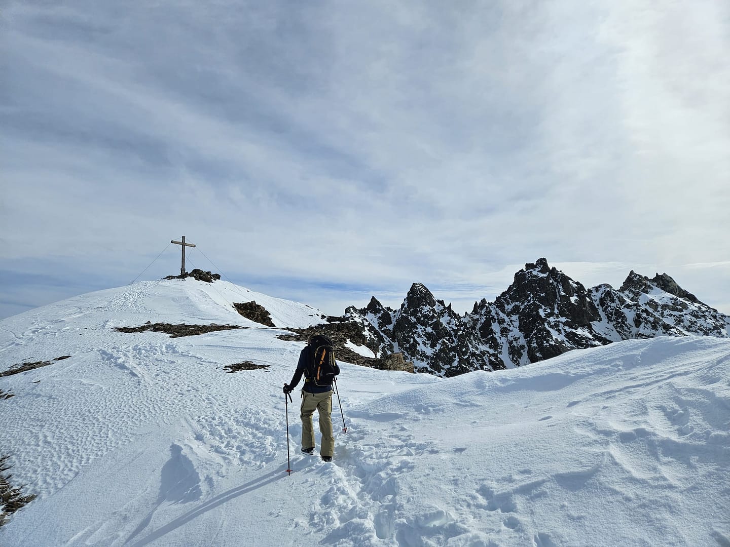 Der finale Aufstieg zur Schapfenspitze ist sehr steil. Wir entschieden uns, nicht der eingezeichneten Skiroute zu folgen, da diese aufgrund der Steilheit auch zu Fuß zurückgelegt werden müsste. Stattdessen orientierten wir uns an den Skispuren weiter links, wo der Hang ebenfalls steil, aber etwas weniger anspruchsvoll war. Auf 3.100 Metern wurde das Gelände flacher, und wir stiegen weiter bis zur Scharte auf. Da der Gipfelbereich aufgrund des Schneemangels sehr felsig war, legten wir hier unser Skidepot an und nahmen die letzten Meter zu Fuß. Oben angekommen, genossen wir den grandiosen 360°-Panoramablick in vollen Zügen.