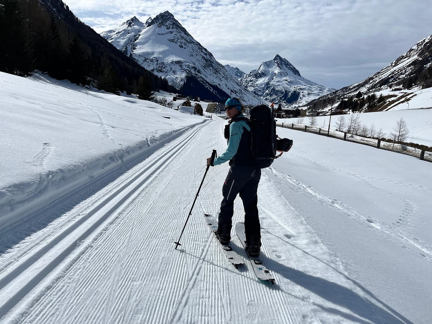 Auf 1.540 Metern erreichten wir eine Loipe, wo wir noch einmal umbauen mussten. Im Skimodus fuhren wir bis Tschafein, um dort in den Bus zu steigen. Zwar hätte man auch bis Galtür weiterlaufen können, aber die fünf Minuten mit dem Bus waren dann doch die angenehmere Option.