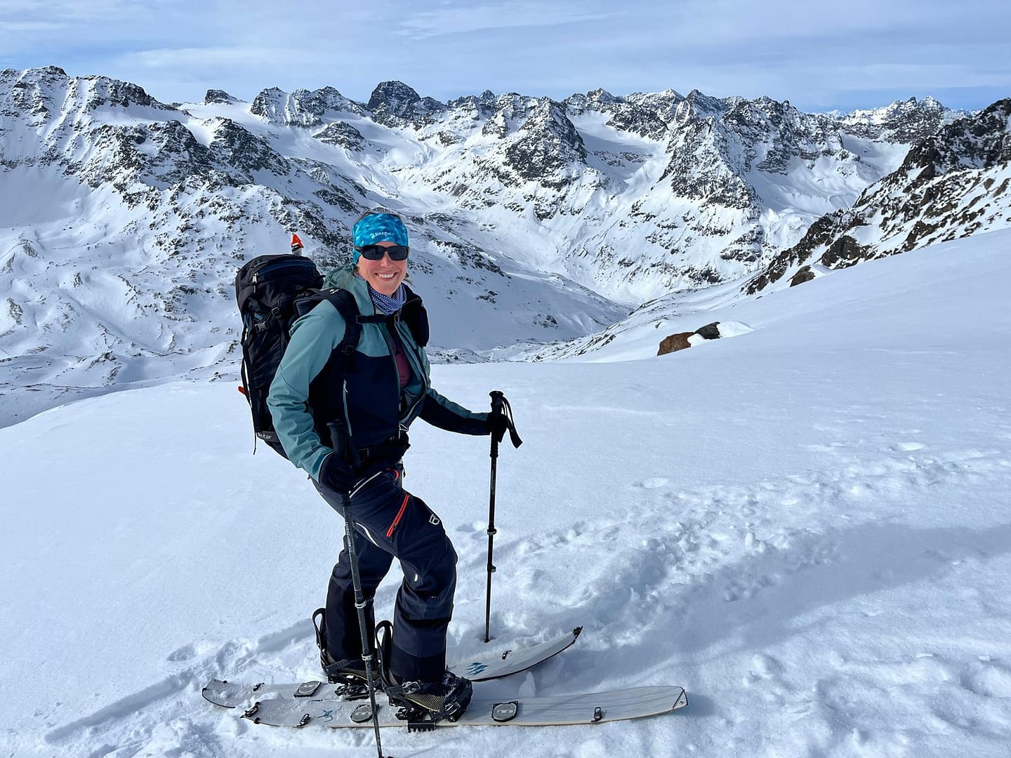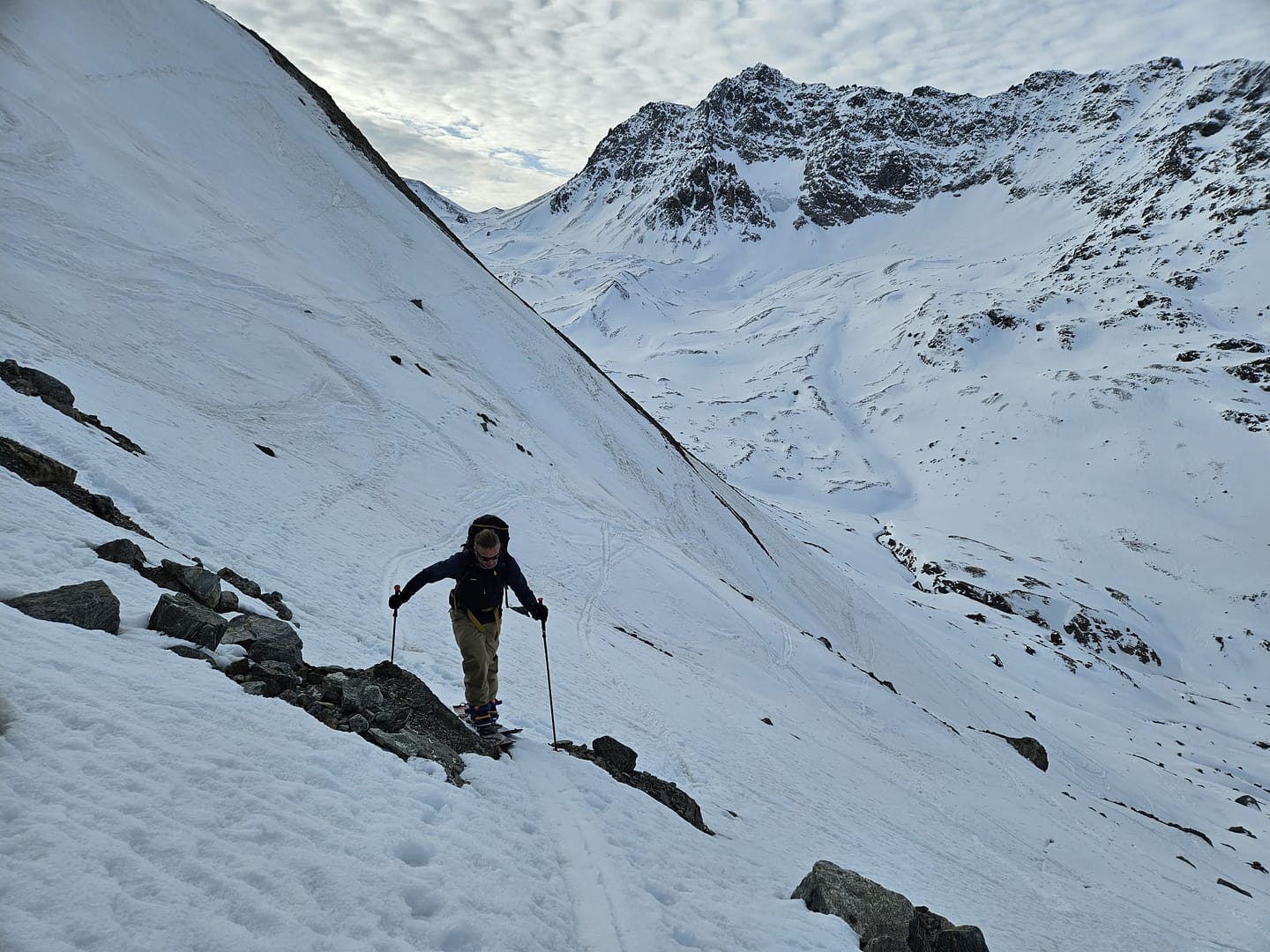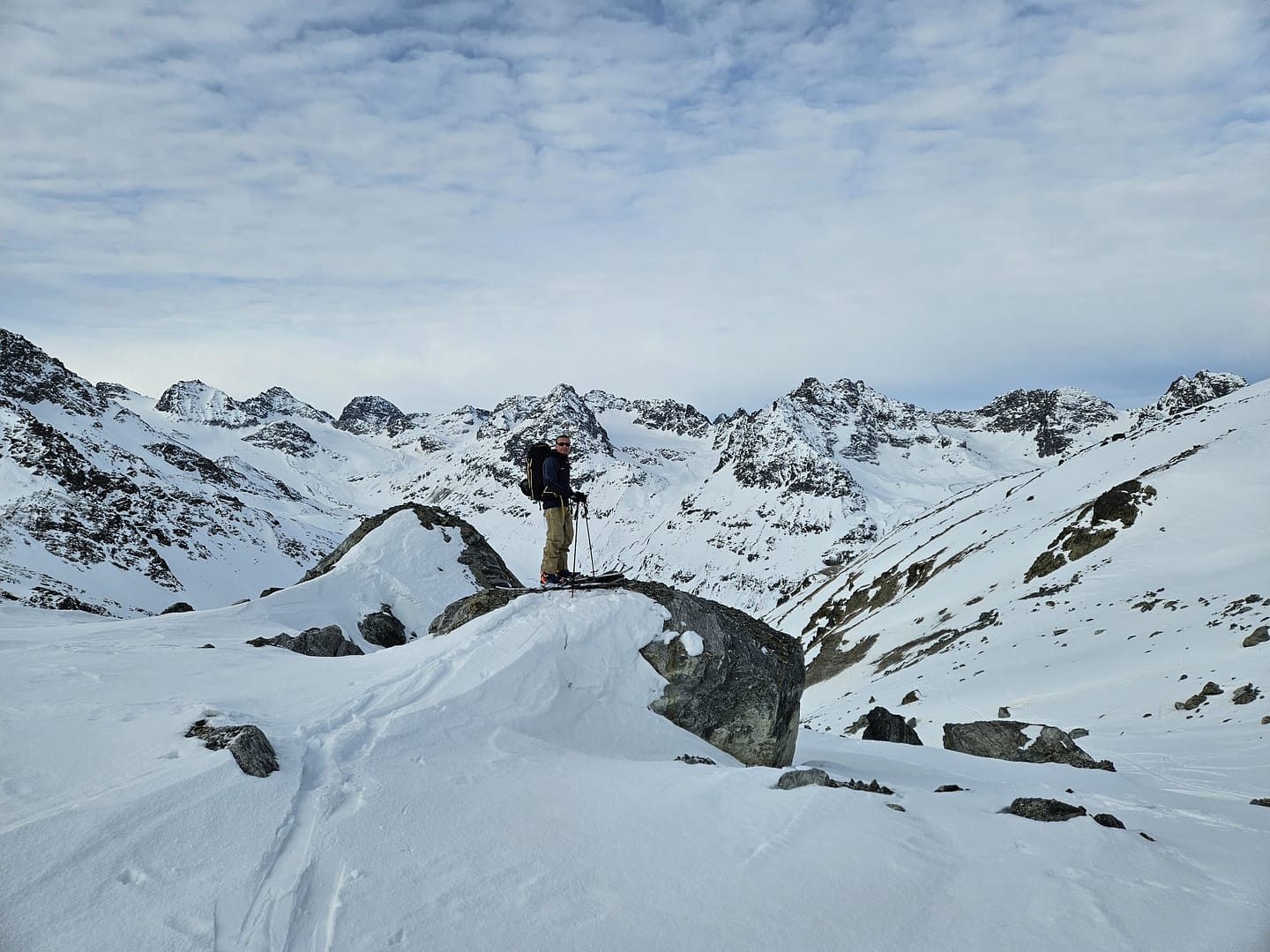 Für die Abfahrt fuhren wir zunächst in nördlicher Richtung hinunter zum Lareinferner. Auf 2.910 Metern wollten wir ein paar Höhenmeter auf eine Scharte wieder hinaufsteigen, um dann ins Jamtal abzufahren. Doch der Schnee war so weich, dass wir keinen Halt fanden. Also entschieden wir uns, weiter ins Lareintal zu fahren. Zwischenzeitlich wurde es ziemlich flach, doch eine Art „Trecker“-Spur zog sich durch das Tal, sodass wir mit etwas Schieben und der Spur den Rückweg gut meistern konnten.
