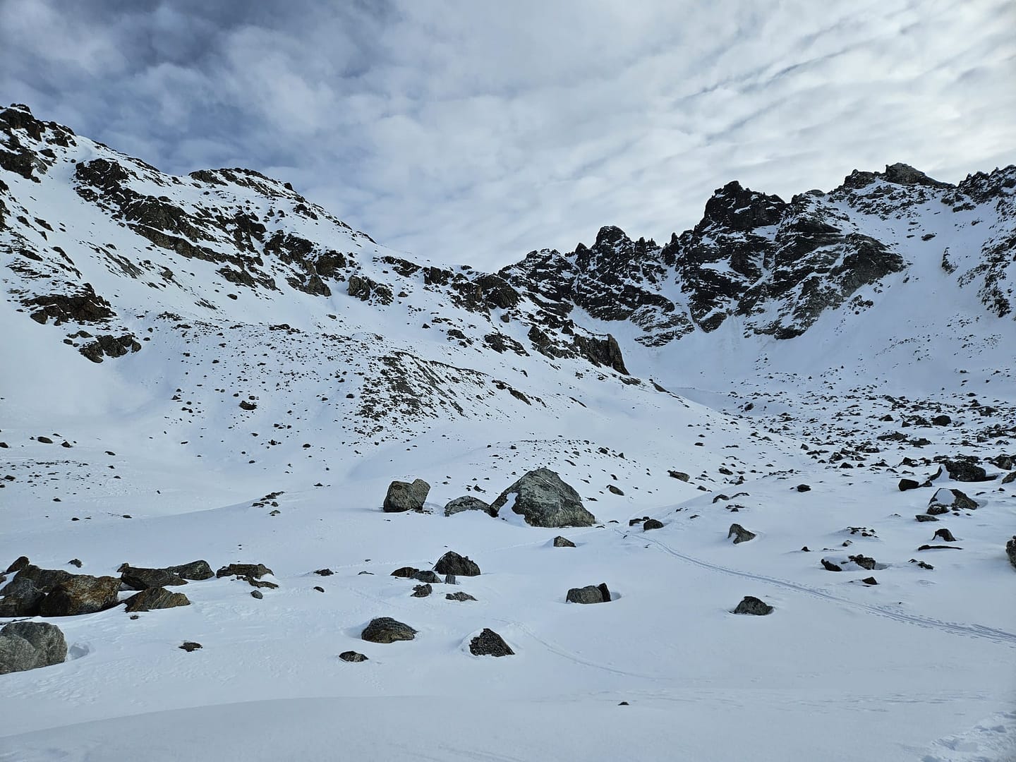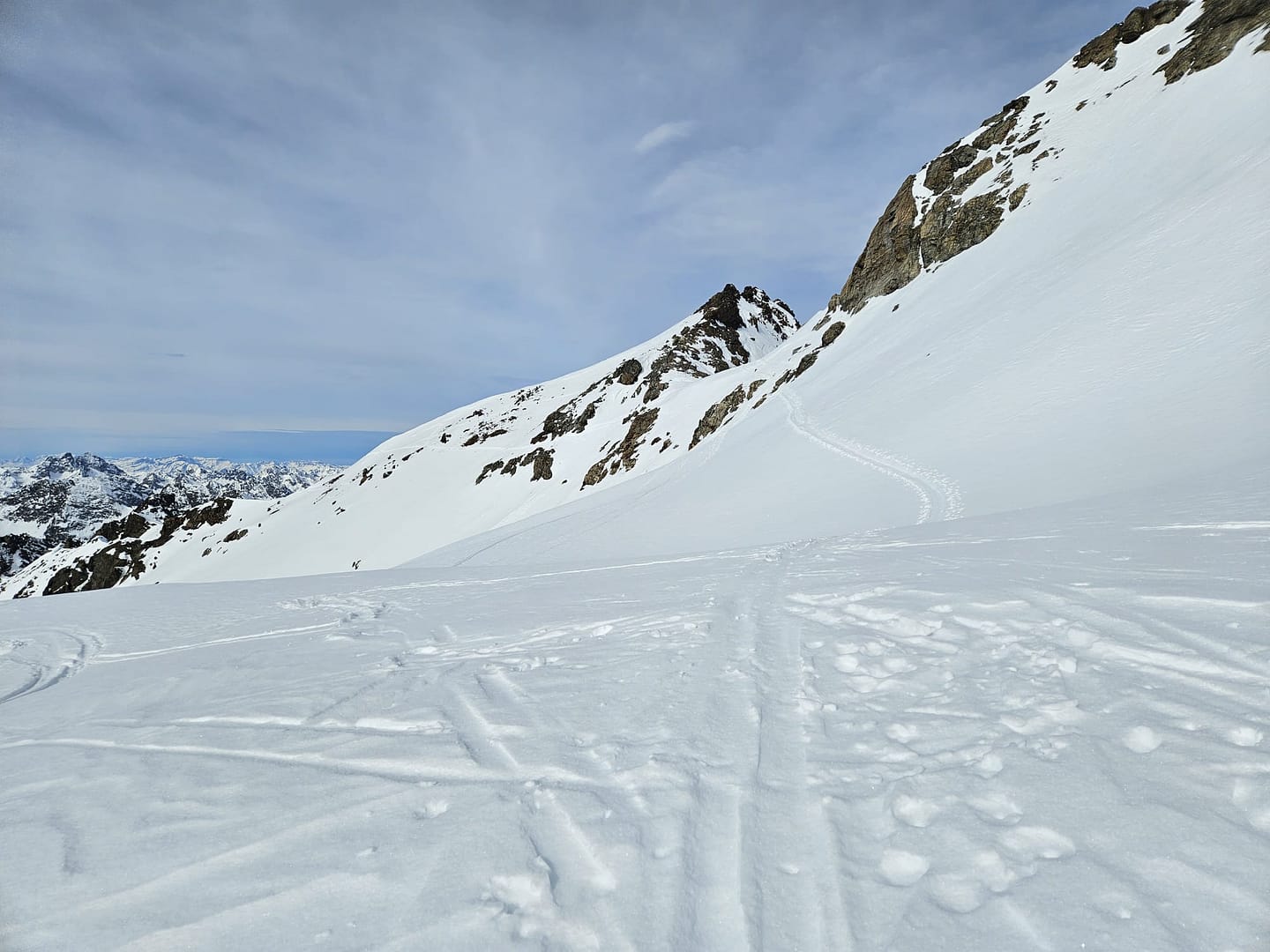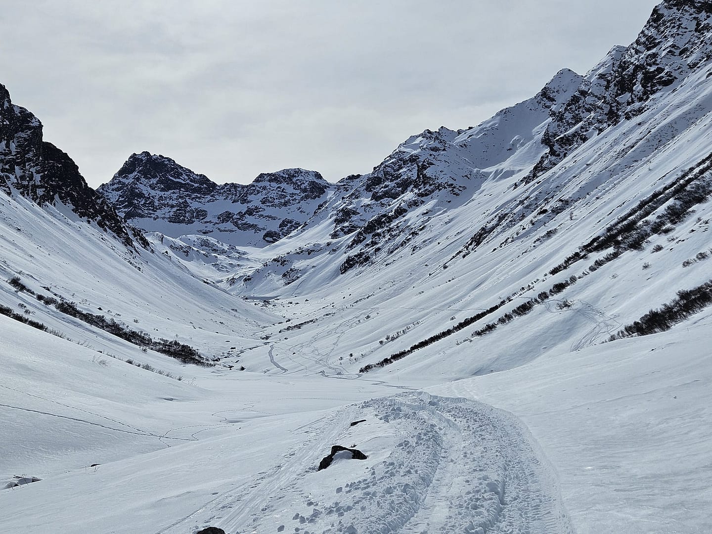 Für die Abfahrt fuhren wir zunächst in nördlicher Richtung hinunter zum Lareinferner. Auf 2.910 Metern wollten wir ein paar Höhenmeter auf eine Scharte wieder hinaufsteigen, um dann ins Jamtal abzufahren. Doch der Schnee war so weich, dass wir keinen Halt fanden. Also entschieden wir uns, weiter ins Lareintal zu fahren. Zwischenzeitlich wurde es ziemlich flach, doch eine Art „Trecker“-Spur zog sich durch das Tal, sodass wir mit etwas Schieben und der Spur den Rückweg gut meistern konnten.
