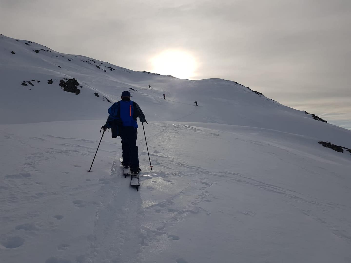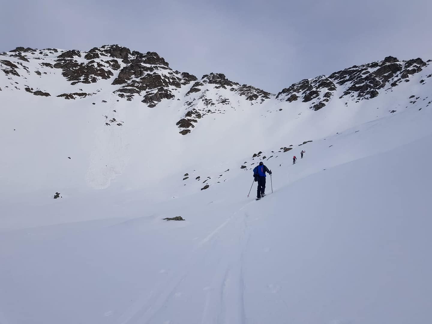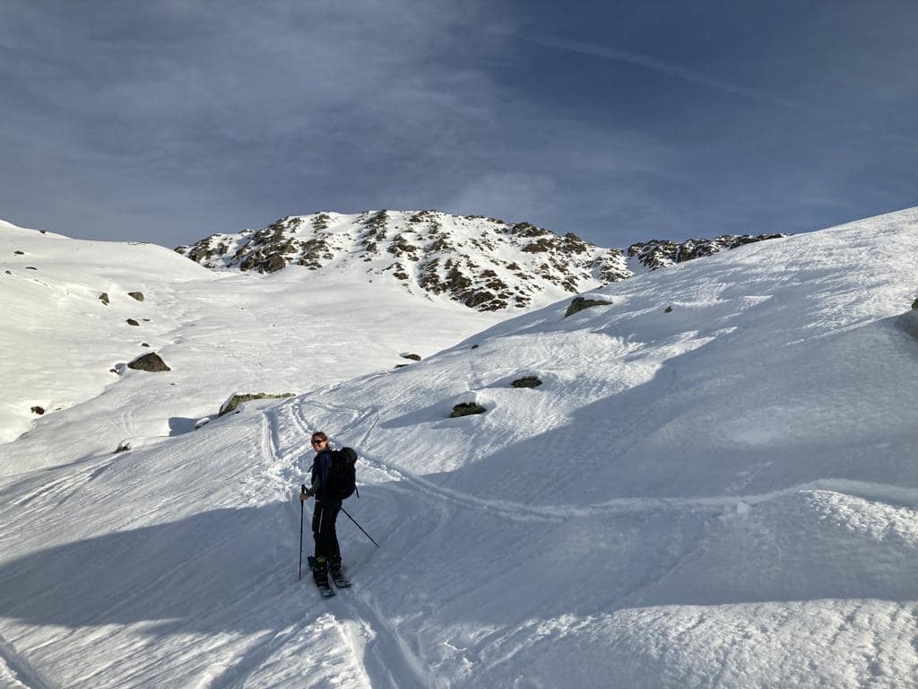 Als dem Tal zog eine eisige und harte Skitourenspur rauf, welcher wir folgten. Wir stiegen neben einem Graben auf der rechten Seite bis zu einer Steilstufe auf, der sich aus der Südflanke des Rastkogels herabzieht.