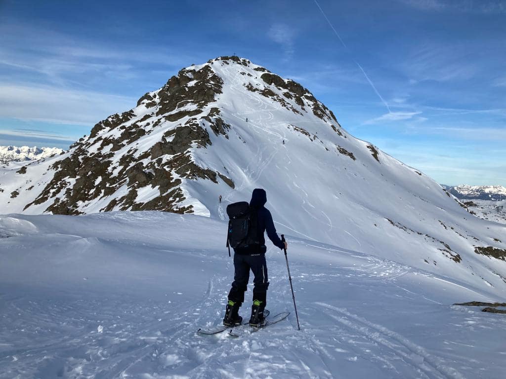 Ein letzter Steilhang wird auf der Ostseite überwunden. Aufgrund der Vereisung haben wir für die letzten drei Spitzkehren unsere Harscheisen draufgezogen, denn die Skifahrer vor uns hatten bereits große Probleme Halt zu finden. Oben angekommen hat man einen tollen Blick auf die Gipfel drumherum.