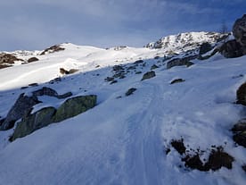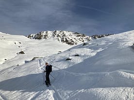 Als dem Tal zog eine eisige und harte Skitourenspur rauf, welcher wir folgten. Wir stiegen neben einem Graben auf der rechten Seite bis zu einer Steilstufe auf, der sich aus der Südflanke des Rastkogels herabzieht.