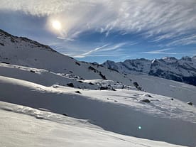 Von Tux-Vorderlanersbach fuhren wir mit der Rastkogelbahn rauf und über die Piste 64 zum 6er Lift Lämmerbichl ab. Oben angekommen schauten wir uns die Bedingungen noch einmal genauer an und starteten hier unsere eigentliche Tour ins Gelände. Zuerst fuhren wir über die Piste 69, die nicht geöffnet/präpariert war, auf ca. 2.130 m runter und fellten an.