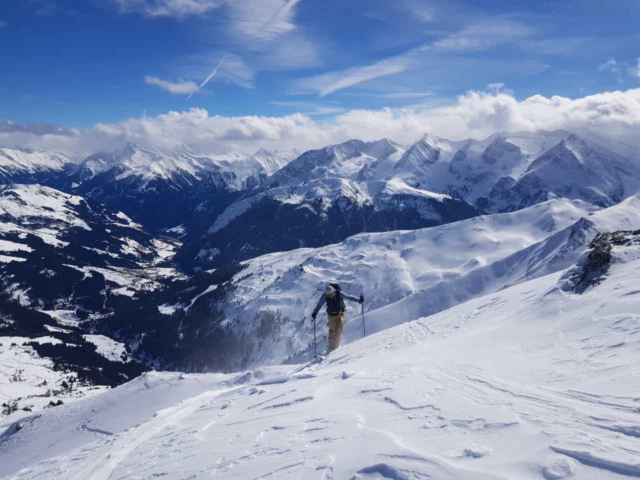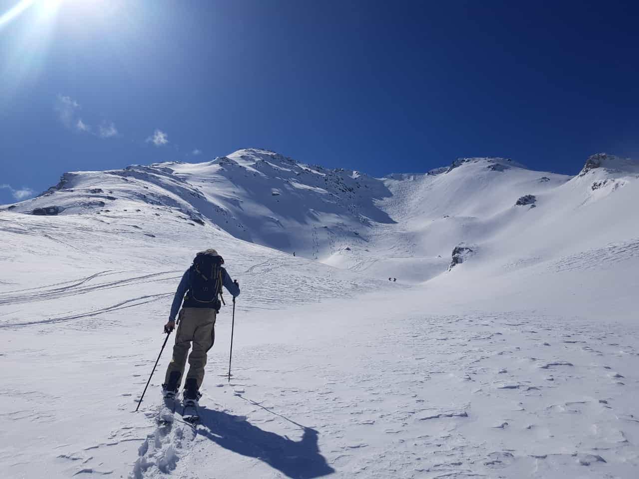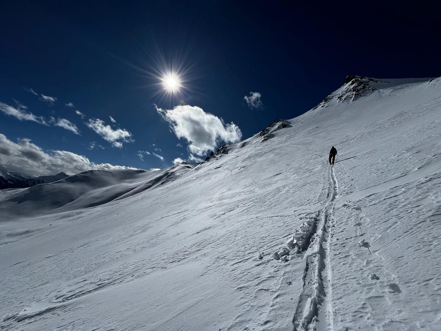 - Skitourenausrüstung: LVS, Sonde, Schaufel, Stöcke, Felle, evtl. Harscheisen