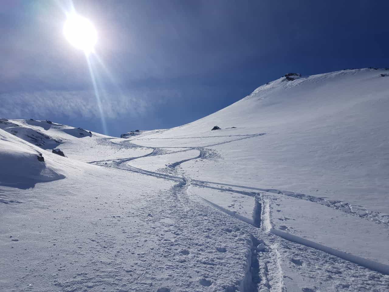 Auf 2.380 m wagten wir uns in den steileren Hang hinab zur Vallruck Alm, leicht windgepresst mit Harschdeckel, aber trotzdem schön zu fahren. Ein kleines Manko an dieser Stelle: Es ist eine kleine Senke unterhalb der Alm und da auch kein Schnee auf der Brücke lag konnten wir nicht einmal genug Schwung nehmen, sodass wir abschnallen mussten. Wäre man stattdessen den Hang vom Aufstieg abgefahren (im großen Bogen nicht an der Alm vorbei), hätte man die Senke umfahren können.