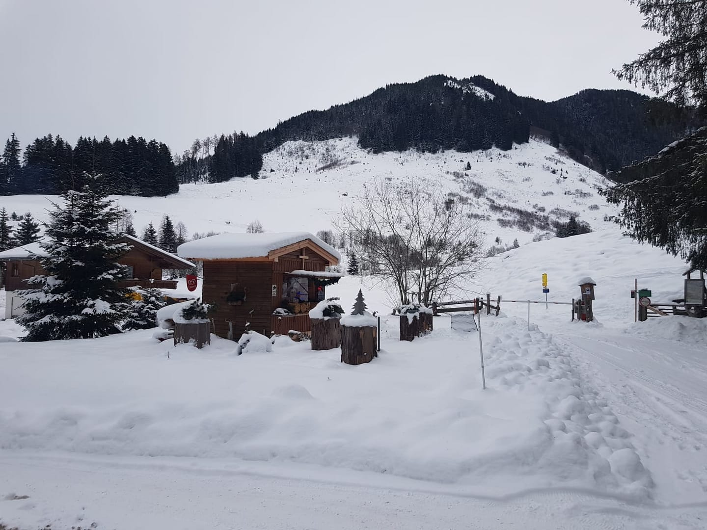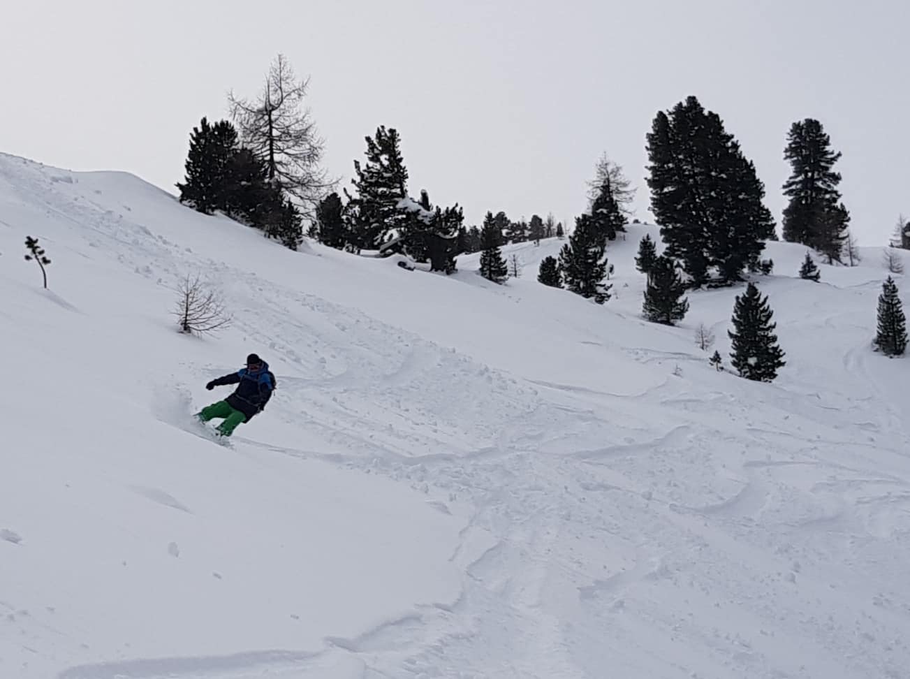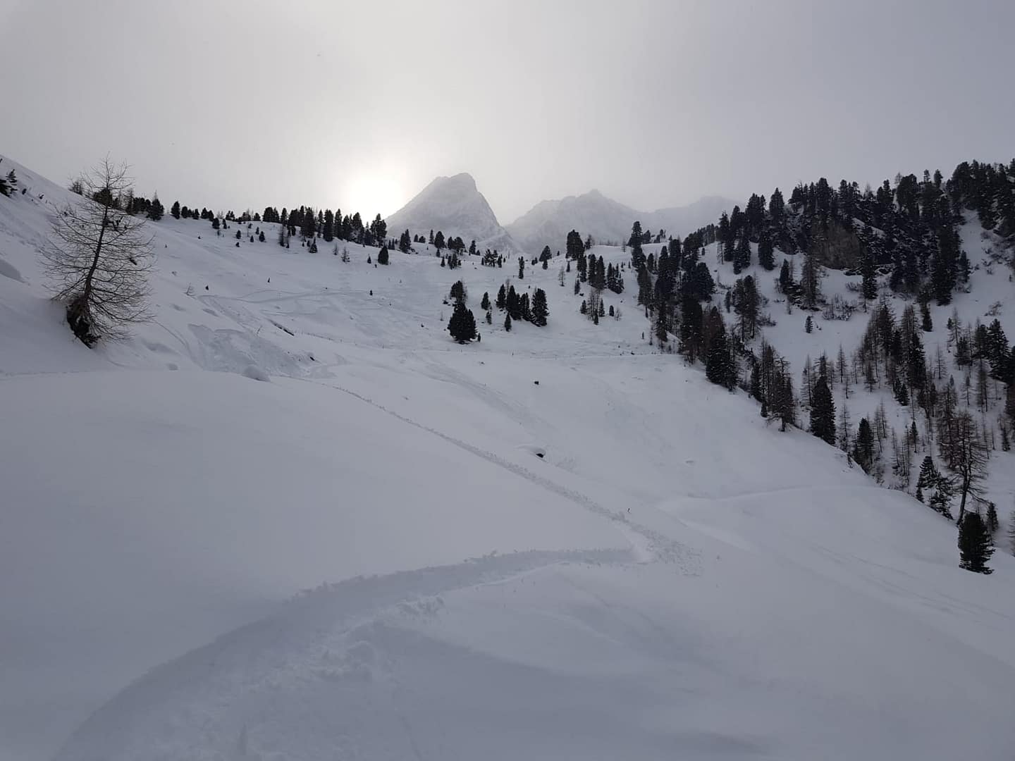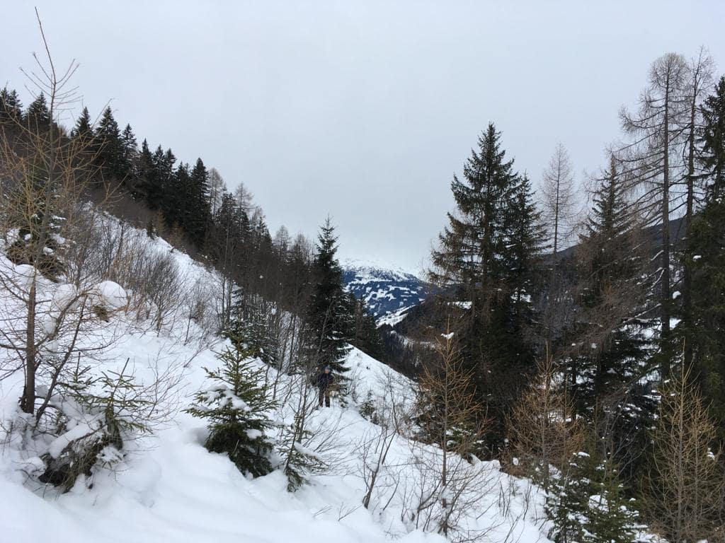 Vom Parkplatz gehen wir unmittelbar nach der Schranke rechts über die freien Wiesenhänge hinauf, wobei wir immer wieder die Fahrstraße queren, die zur Weißbachalm führt. Ein Stück folgen wir der leicht ansteigenden Fahrstraße durch den Wald hindurch. Keine Sorge, die Abfahrt funktioniert hier sehr gut. 🙂 Sobald wir das Waldstückchen hinter uns gelassen haben, gelangen wir sehr bald durch die große Almschneise zur Weißbachalm Mitterleger.