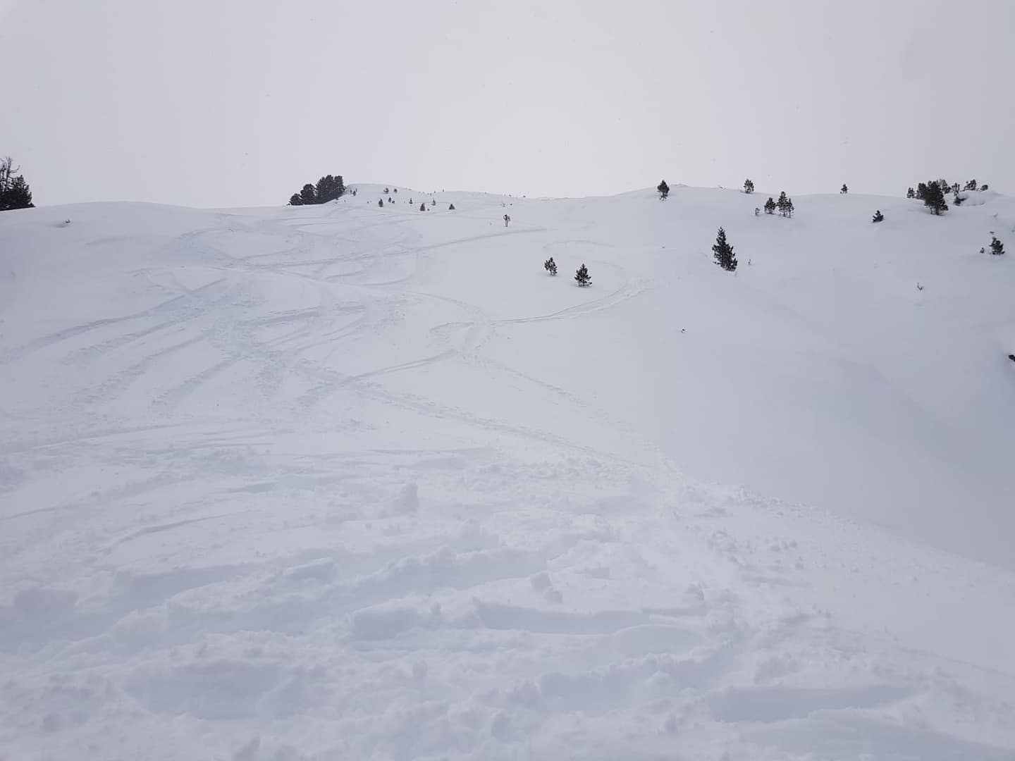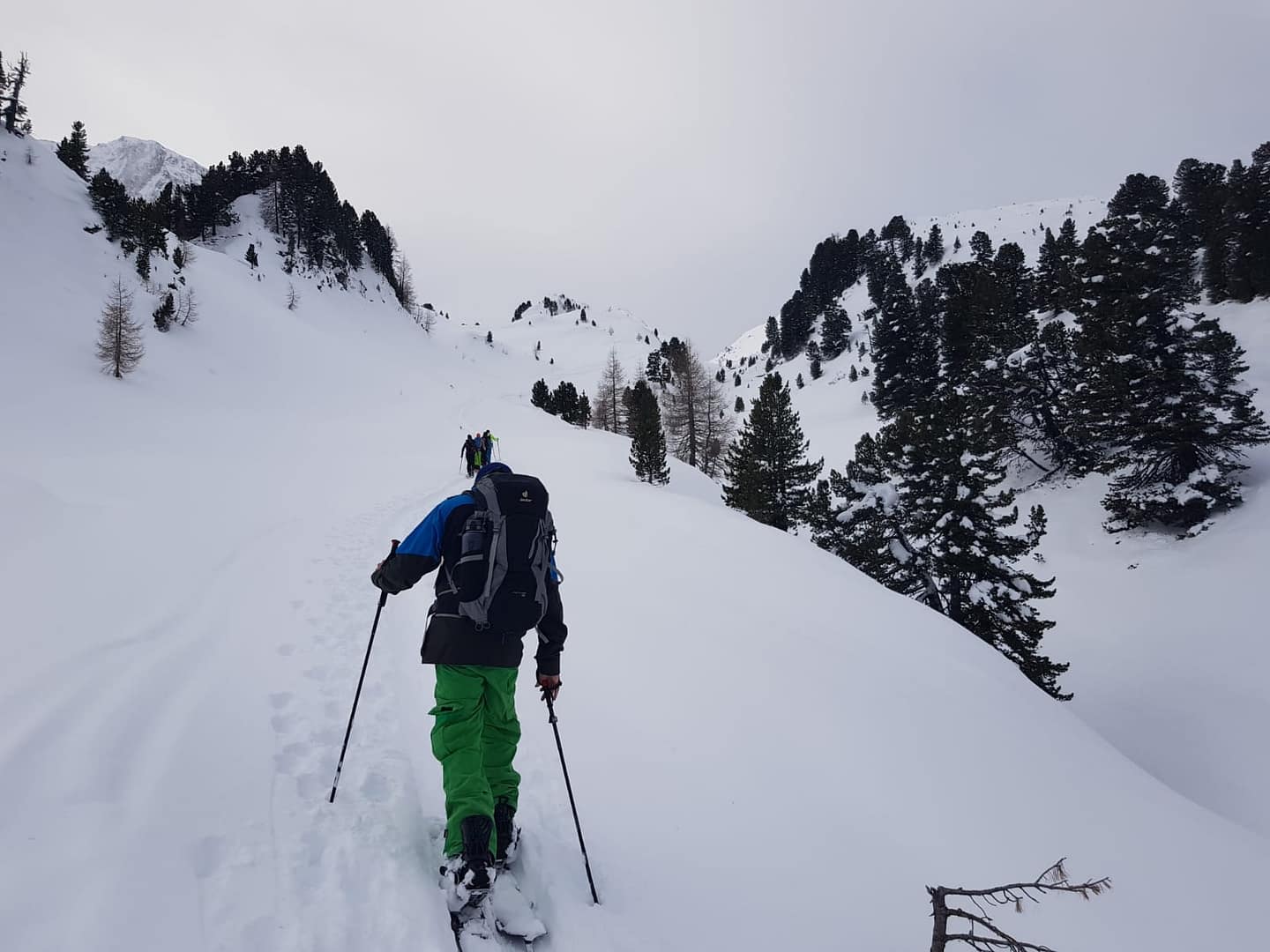 Bei sicheren Verhältnissen kann man auch direkt unterhalb vom Gipfel den steilen Hang in die breite Mulde zwischen Torhelm und Seespitze abfahren und gelangt später wieder auf die Aufstiegsroute.