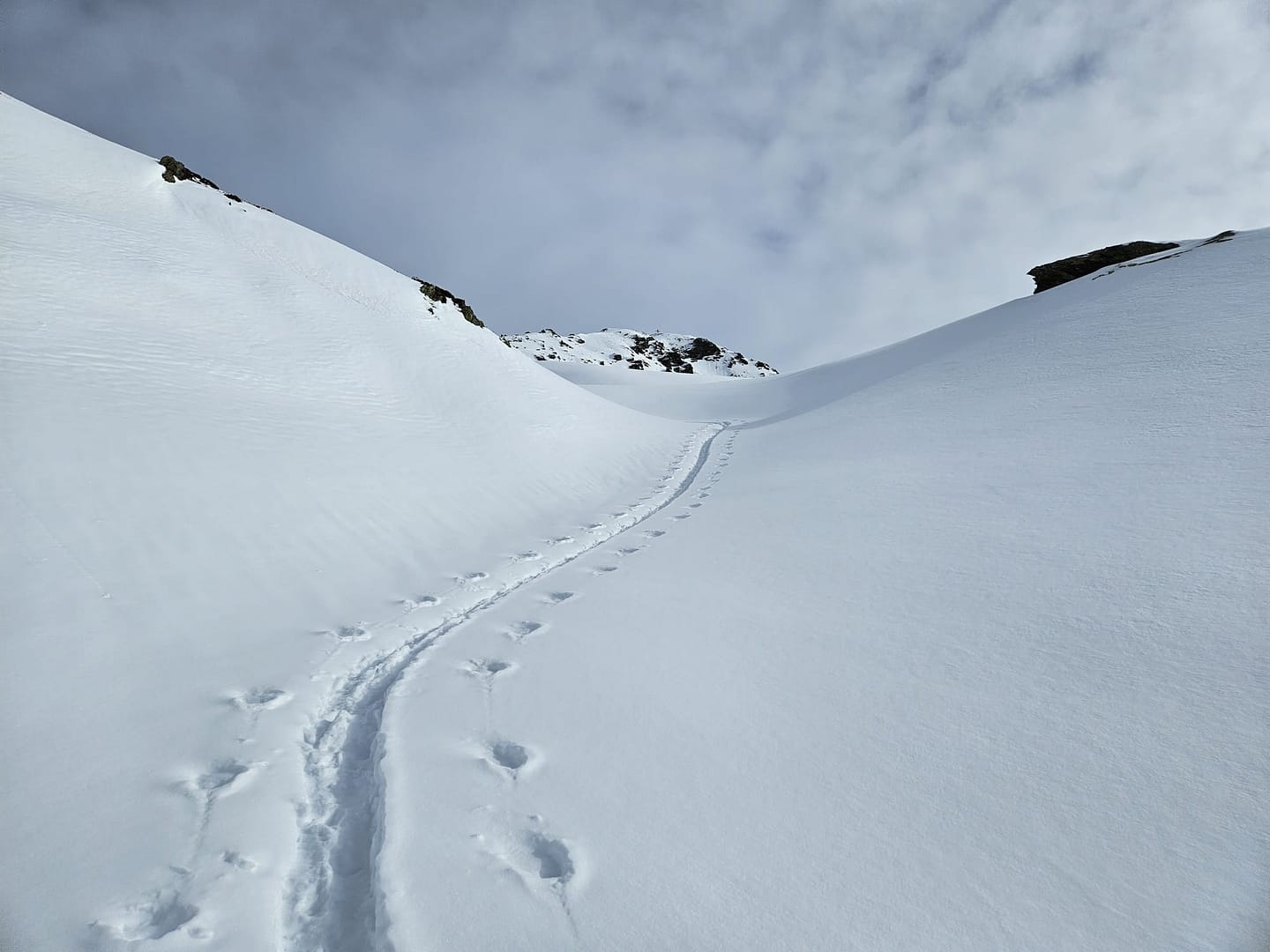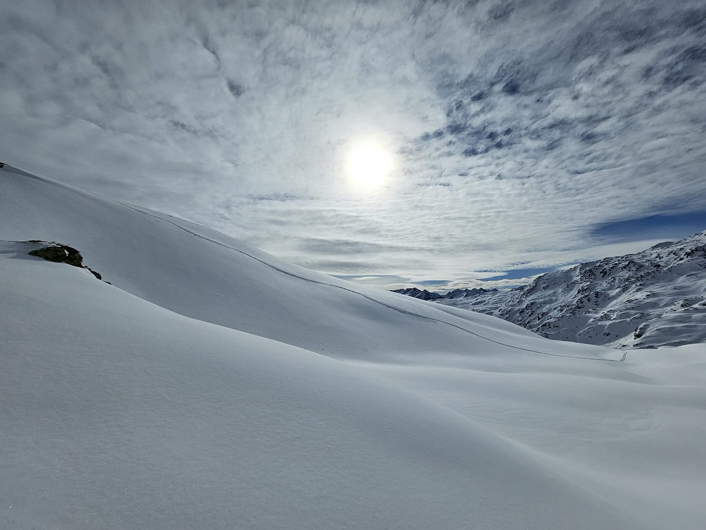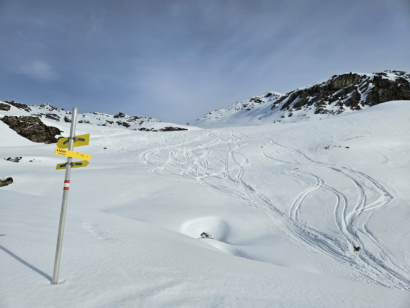 Da wir eine Saisonkarte für die Lifte haben und gesundheitlich nicht ganz fit waren, entschieden wir uns für eine gemütliche Skitour mit Liftunterstützung. Zunächst fuhren wir mit der Bahn bis zur Bergstation Kapauns. Von dort ging es im Snowboard-Modus über die Piste abwärts bis auf 2.350 m, wo wir die markierte Piste verließen. Ab hier gibt es verschiedene Varianten für die Weiterfahrt. Wer genug Schwung hat oder mit Skiern unterwegs ist, nimmt am besten den Weg über den „Langen See“.