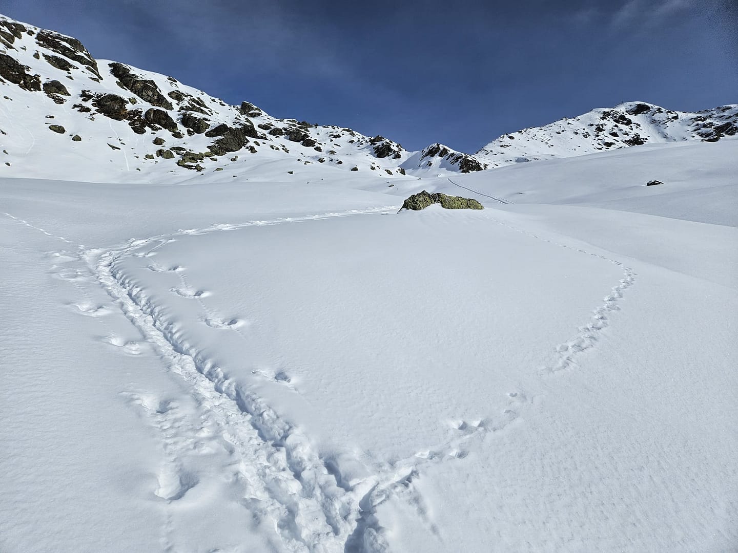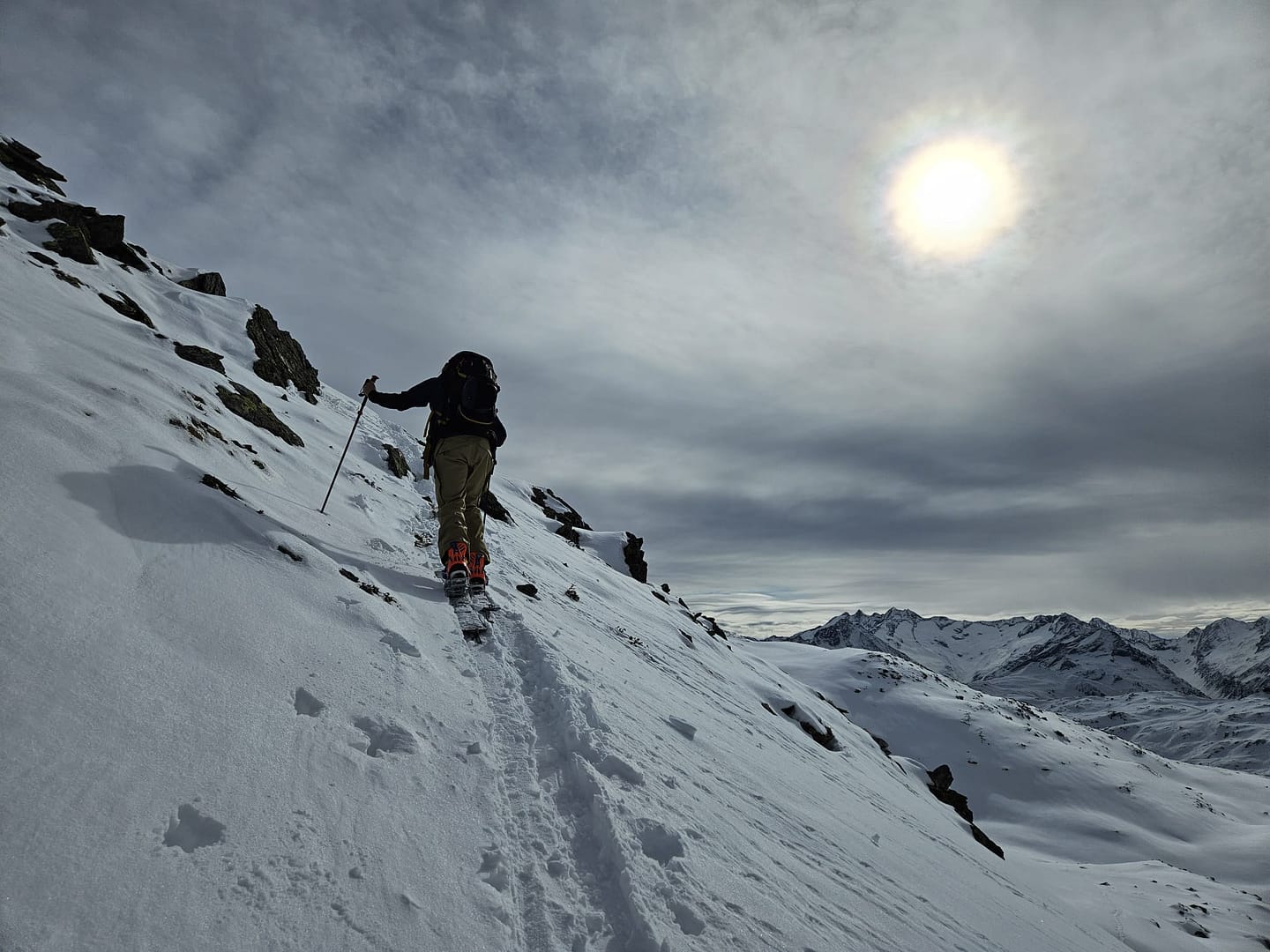 - Skitourenausrüstung: LVS, Sonde, Schaufel, Stöcke, Felle, evtl. Harscheisen