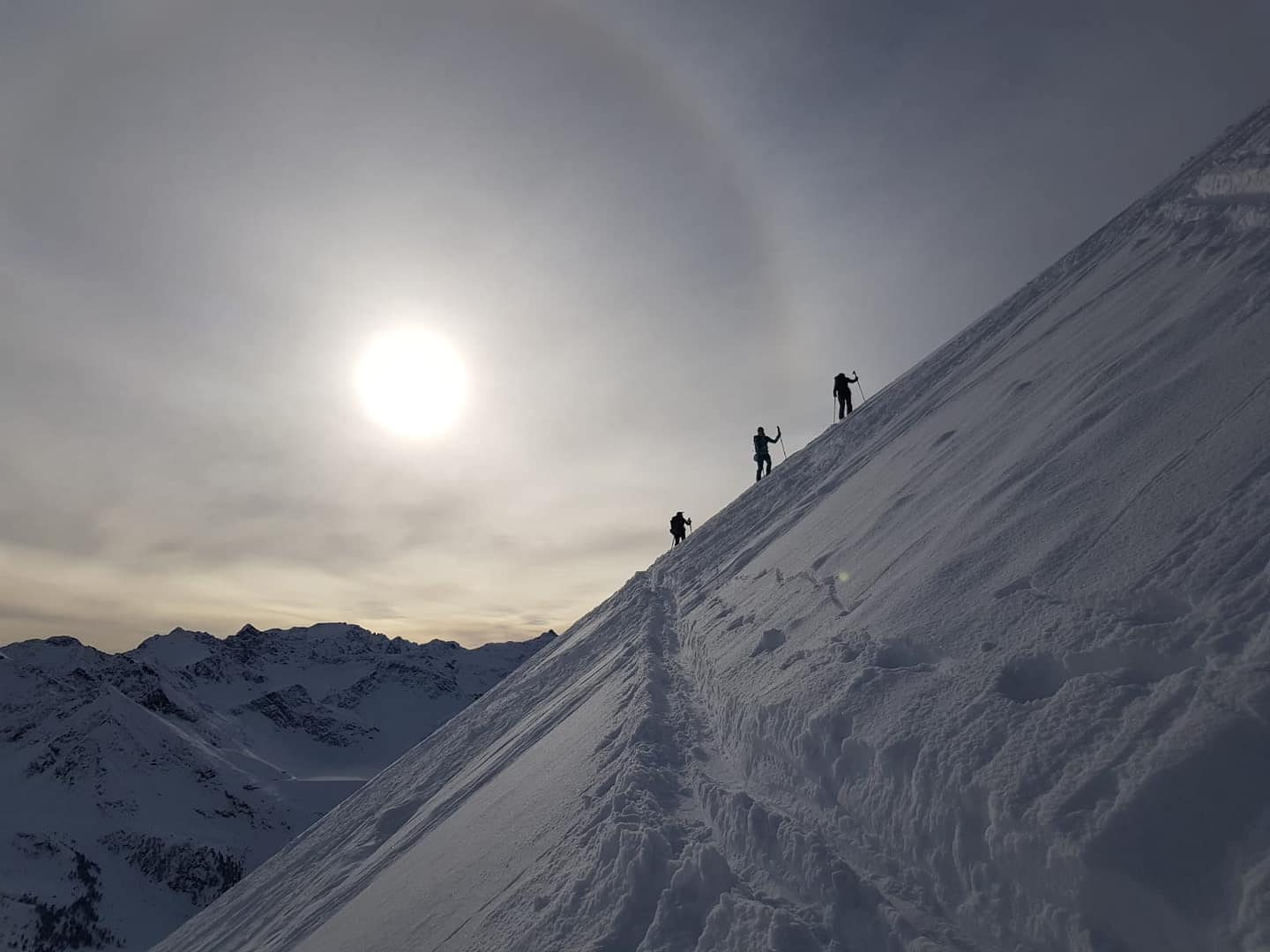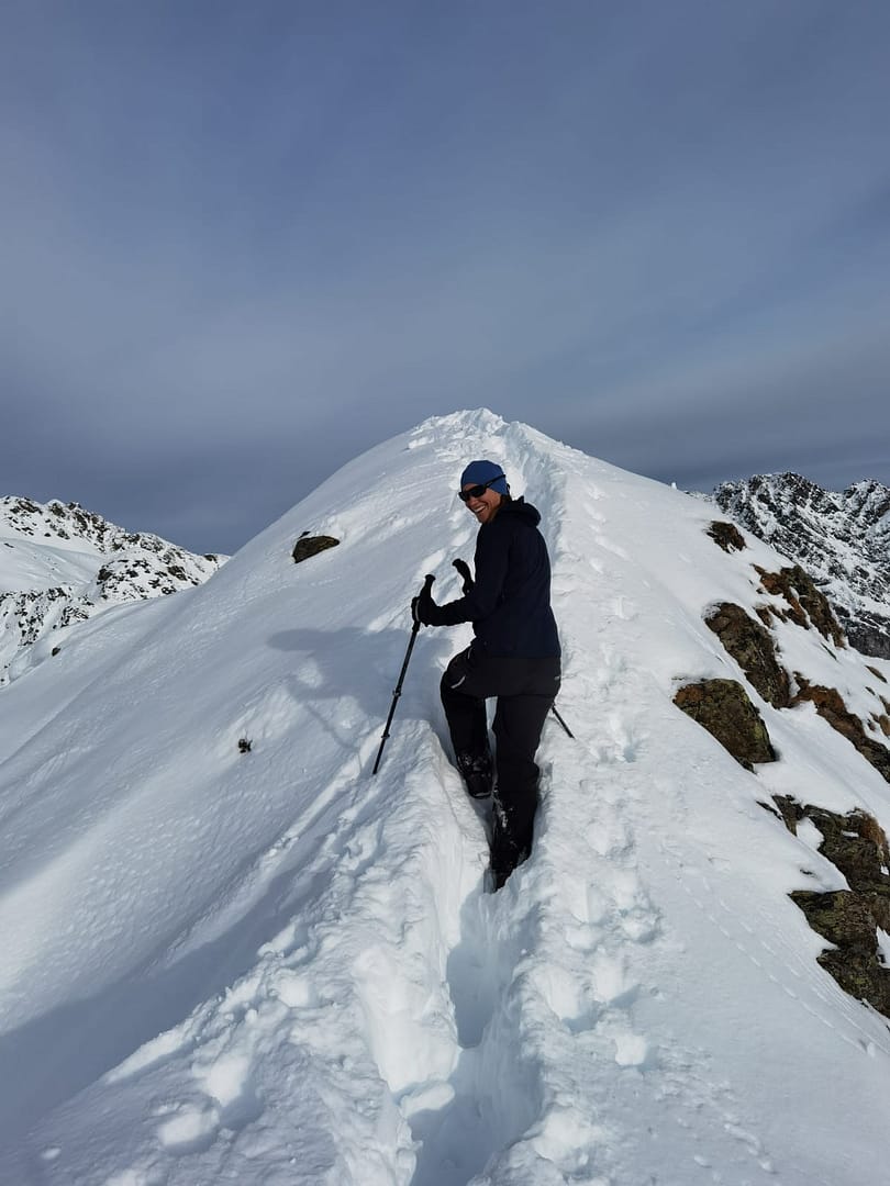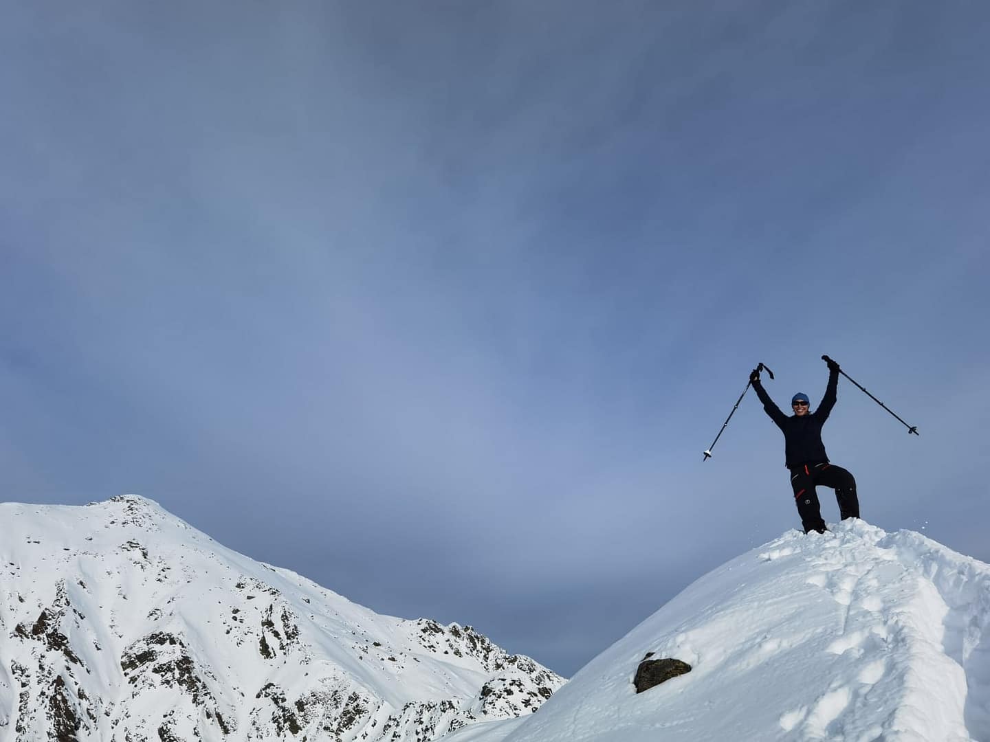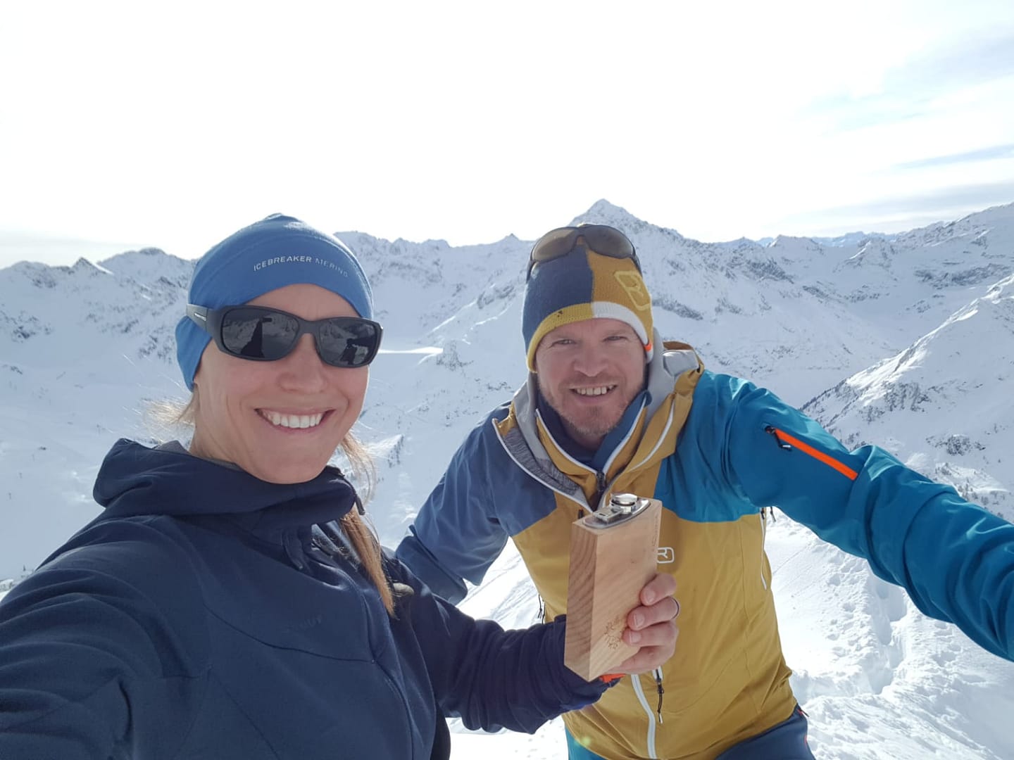 Vor dem letzten Stück des Vorderen Grieskogels haben wir ein Skidepot gemacht und sind die letzten Meter zu Fuß über den Grat zum Gipfel gelaufen. Oben gab es dann einen sehr leckeren Zirbenschnaps. Jami!