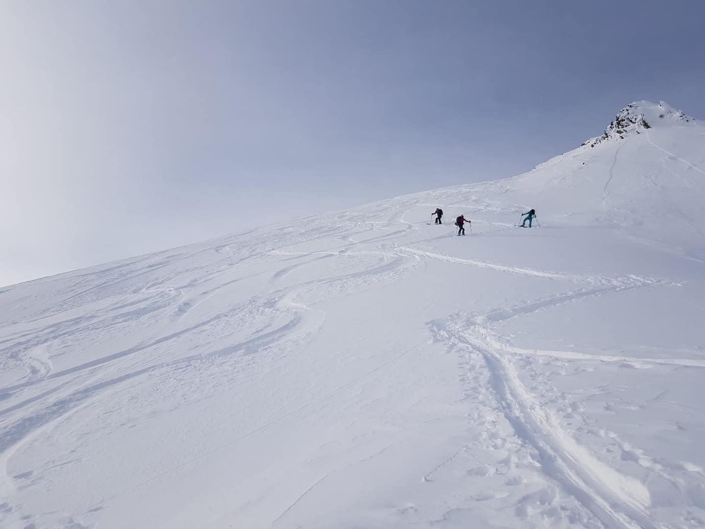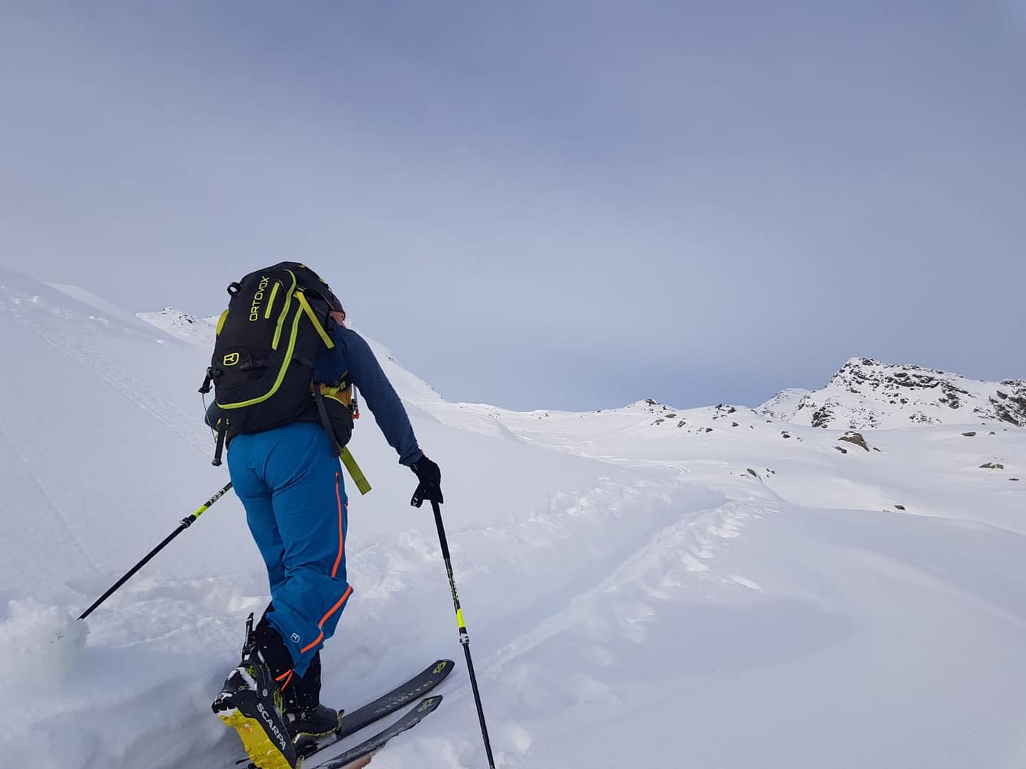 Wir allerdings haben doch ein „Abenteuer“ sowie eine Herausforderung gesucht und sind direttissima den sehr steilen Hang links von der Rinne auf den Rücken rauf. Am Ende führen beide Wege auf den Rücken, von wo man dann in mehreren Spitzkehren den steilen Gipfelhang besteigt.