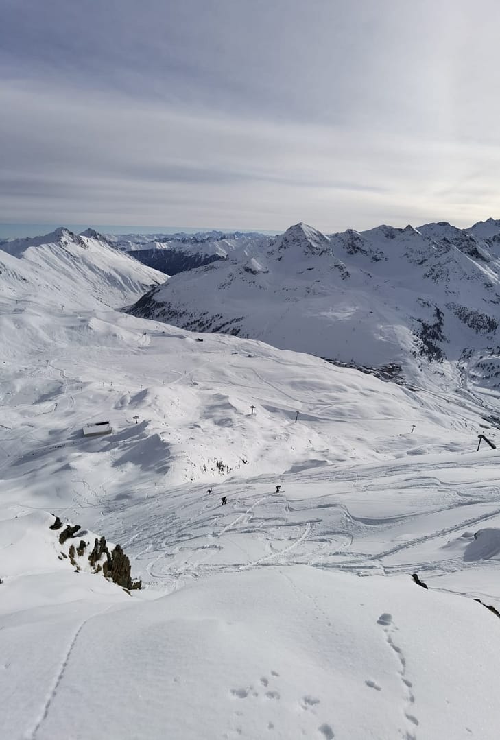 Am Anfang geht es erst einmal gerade den Hang runter, bei uns war runterblickend der Schnee rechts etwas mehr, so dass die meisten dort gefahren sind. Wir hingegen haben den unverspurten Hang weiter links genutzt und zum Glück keinen / kaum Steinkontakt gehabt. Ungefähr auf der Hälfte vom Hang sollte man sich entscheiden, ob man links den flacheren Hang runter fährt (durch das Kar der Grieskogel) oder wie wir die steilere Rinne rechts. Ab der Bergstation des Schwarzmoosliftes gibt es viele Varianten im Skigebiet.