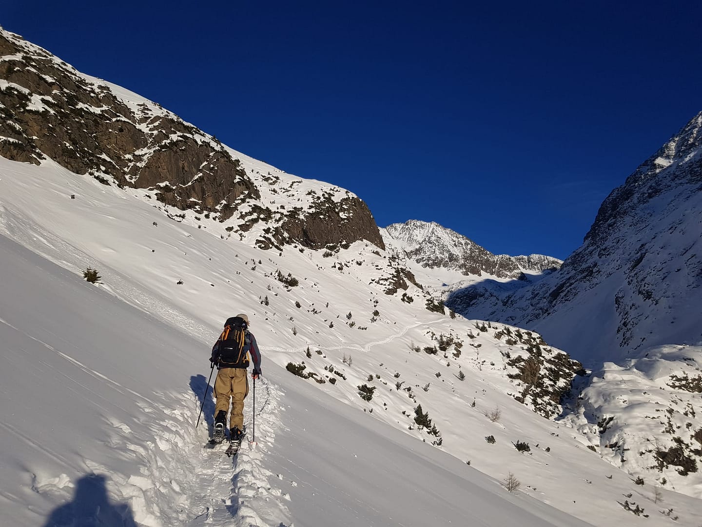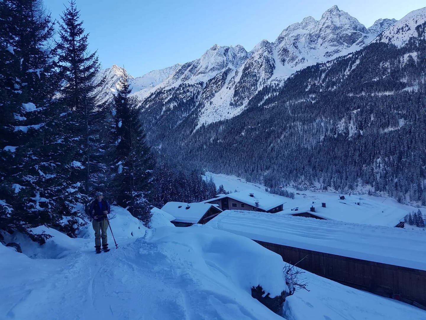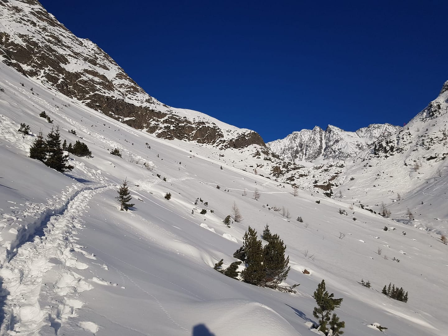 Entlang des Winterwegs passieren wir ein Kleinkraftwerk und eine imposante Felswand, gespickt mit glitzernden Eiszapfen, was für eine winterliche Kulisse. Wenig später unterlief uns jedoch ein kleiner „Fehler“. Ideal wäre es gewesen, den Winnebach zu überqueren und dann rechts (taleinwärts) aufzusteigen. Leider ließen wir uns von anderen Spuren verleiten und wichen stattdessen in Richtung Sommerweg ab. Dies ist allerdings nur empfehlenswert, wenn die Lawinenbedingungen äußerst günstig sind, denn die Hänge entlang des Sommerwegs sind lawinengefährdet.