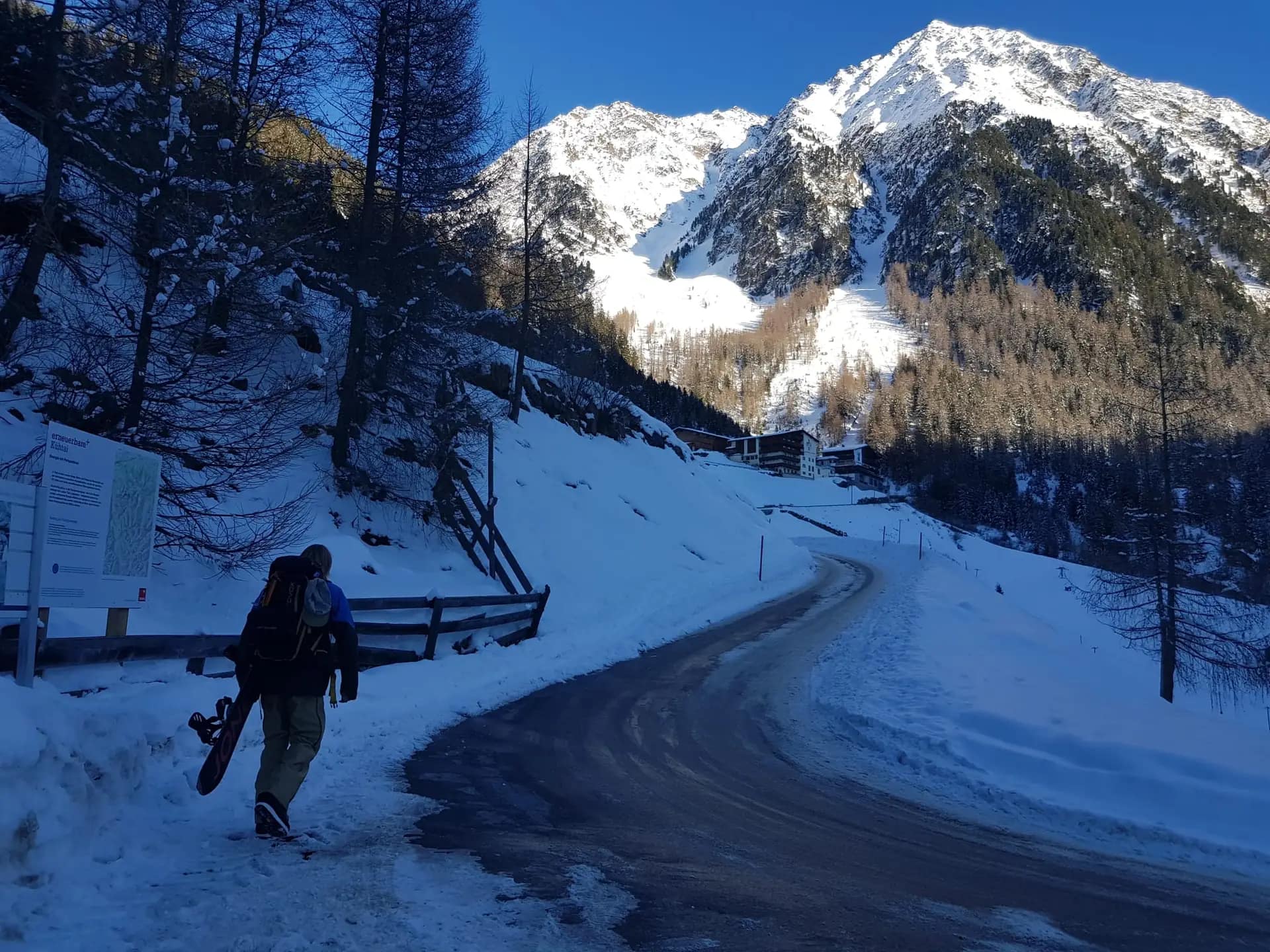 Entlang des Winterwegs passieren wir ein Kleinkraftwerk und eine imposante Felswand, gespickt mit glitzernden Eiszapfen, was für eine winterliche Kulisse. Wenig später unterlief uns jedoch ein kleiner „Fehler“. Ideal wäre es gewesen, den Winnebach zu überqueren und dann rechts (taleinwärts) aufzusteigen. Leider ließen wir uns von anderen Spuren verleiten und wichen stattdessen in Richtung Sommerweg ab. Dies ist allerdings nur empfehlenswert, wenn die Lawinenbedingungen äußerst günstig sind, denn die Hänge entlang des Sommerwegs sind lawinengefährdet.