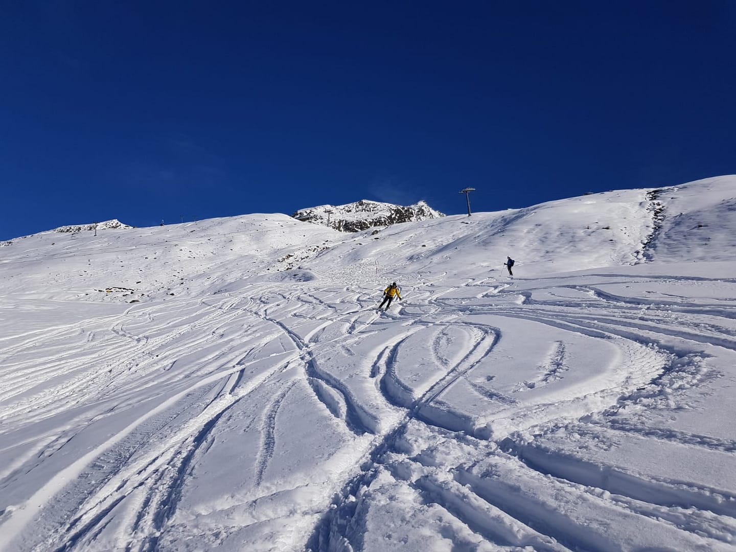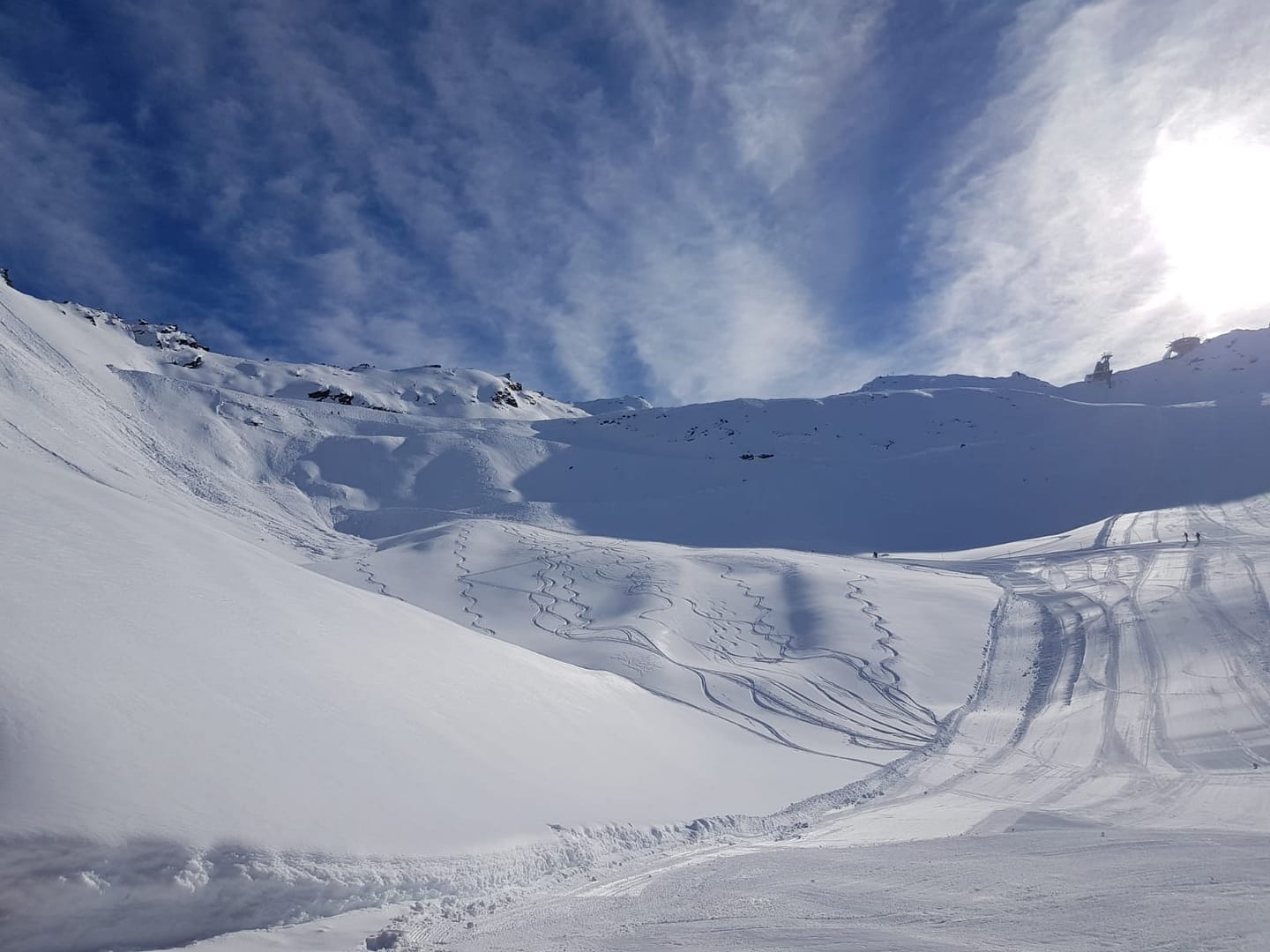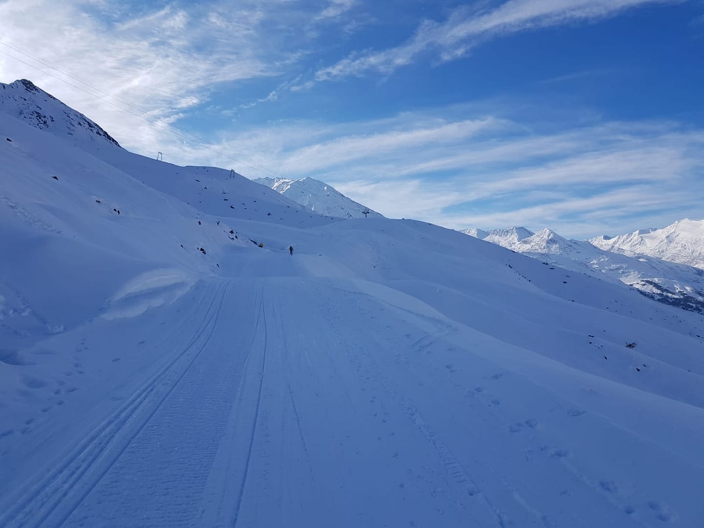 Über die Pisten und teilweise auch durch das Gelände steigen wir in mäßiger Steigung in das große Kar auf. Das letzte Stück zur Top Mountain Star (Rundes Restaurant-Bar neben der Bergstation vom Wurmkogellift) kann man entweder über die schwarze Piste oder links daneben in Serpentinen aufsteigen.