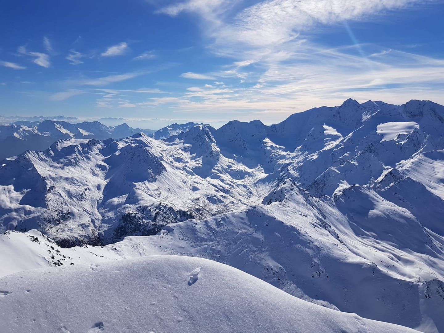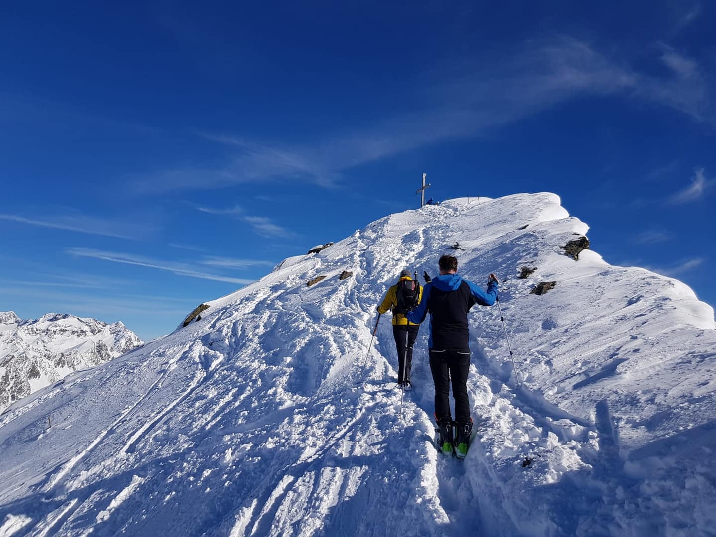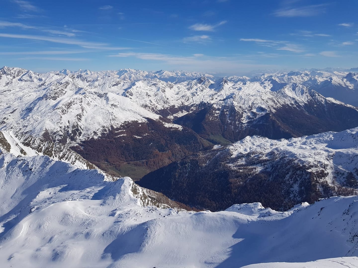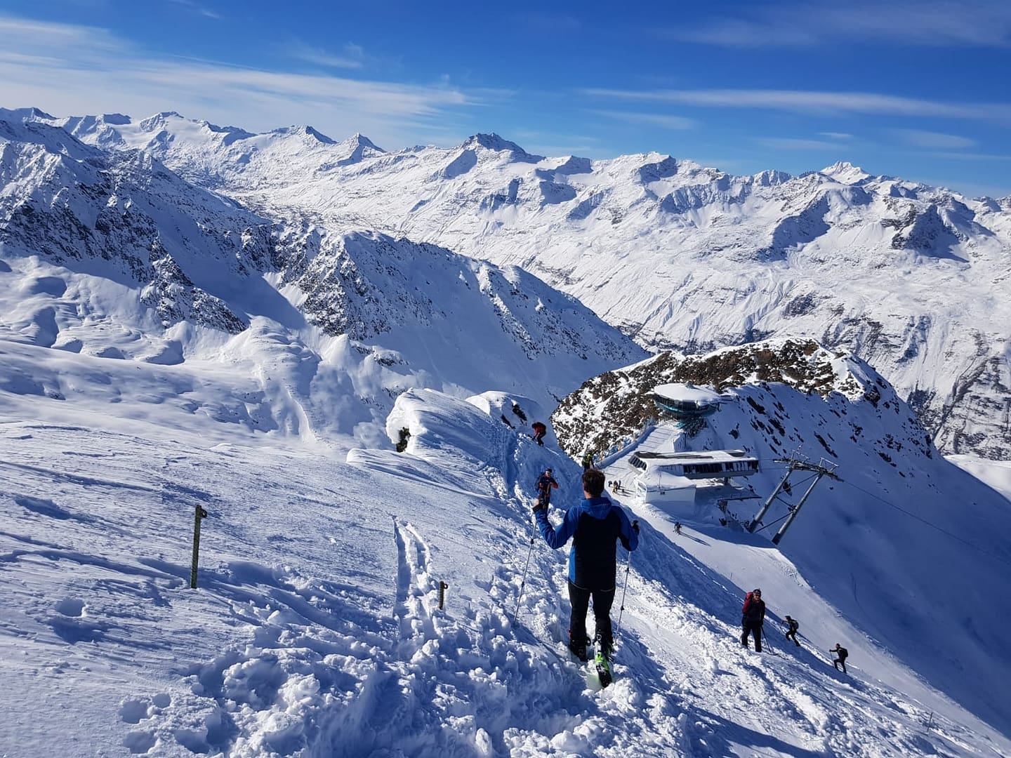 An der Bergstation angekommen haben wir ein Ski-Depot gemacht, da der Hang vom Gipfel noch nicht richtig gefestigt war und bereits ein paar Steine sichtbar waren. Also Skischonend sind wir zu Fuß zum Gipfel gelaufen. Am Gipfel des Wurmkogels erwartet uns eine traumhafte Aussicht auf Nord- und Südtirol.