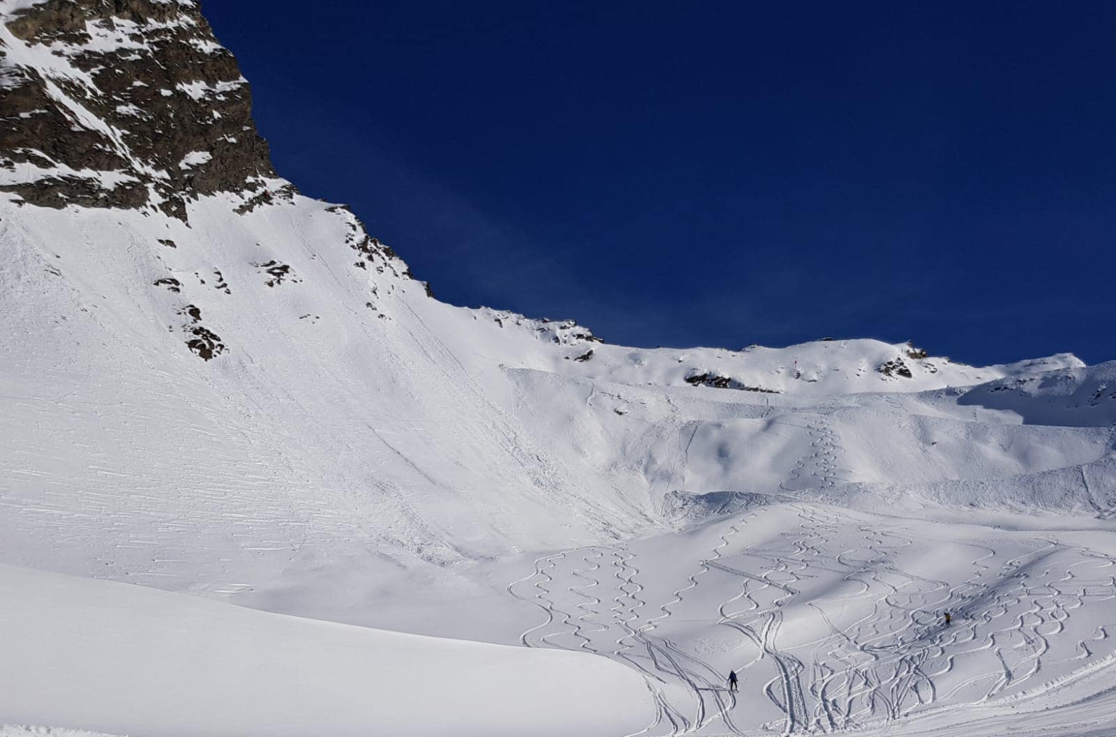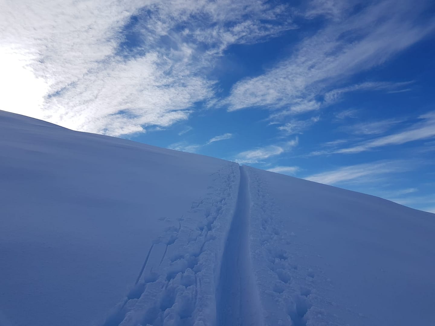 Der Abstiegt erfolgt entlang der Aufstiegsroute zum Ski-Depot. Bei der Abfahrt lässt das weitläufige Gebiet unzählige Varianten zu.