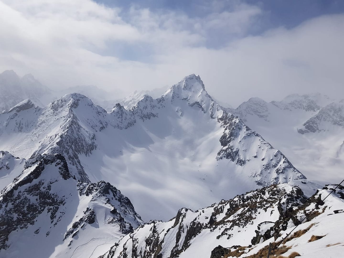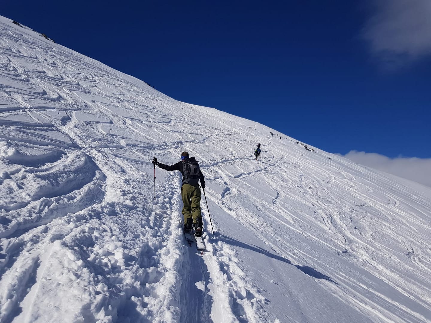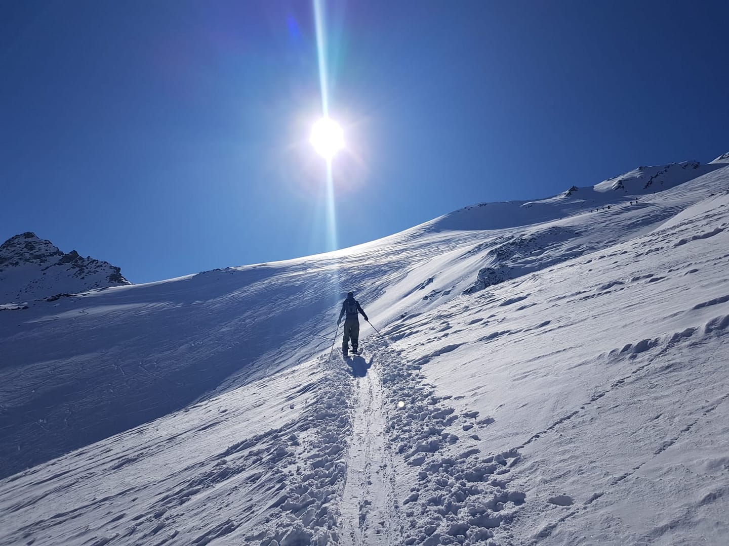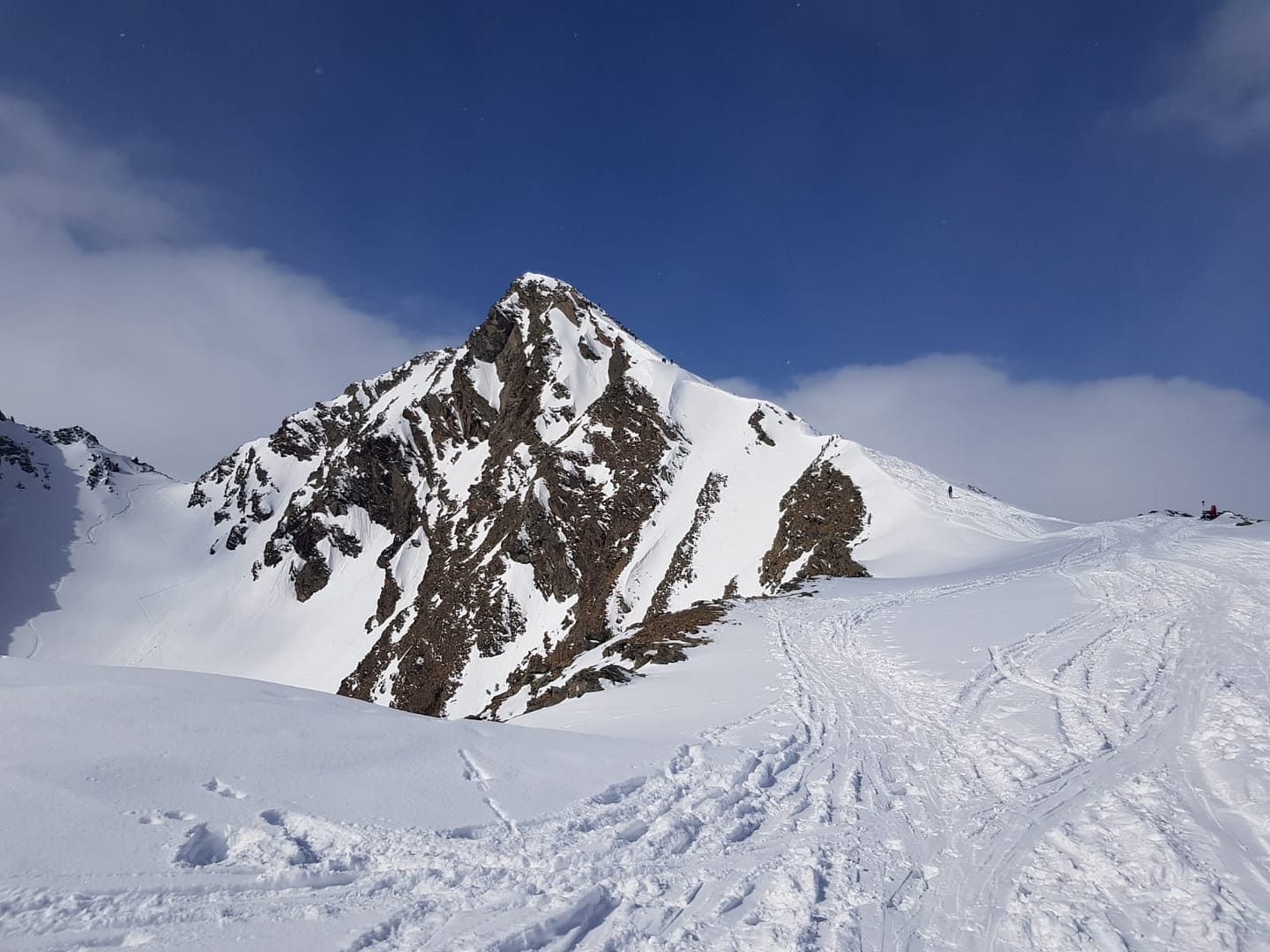 Am Talschluss steigt man in Serpentinen südöstlich der Sattelschröfen bis zu einem breiten Rücken (2.860 m) rauf, wo man das flache Stück zum Gipfelaufbau quert. Hier wird ein Skidepot gemacht, denn die letzten Meter über den Ostgrat werden zu Fuß zurück gelegt. Wir hatten Glück und mussten die Harscheisen nicht anlegen, der Grat jedoch war sehr rutschig beim Abstieg, so dass man ordentlich aufpassen musste.