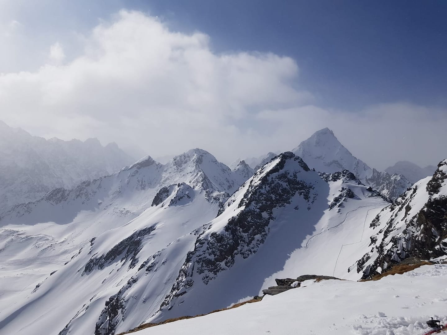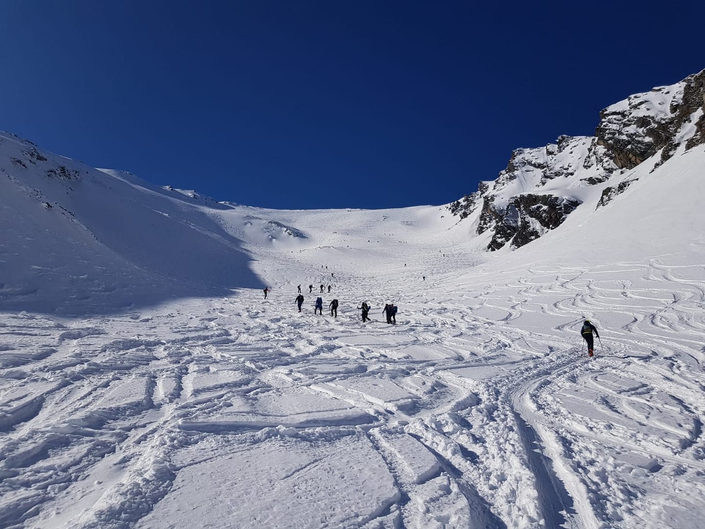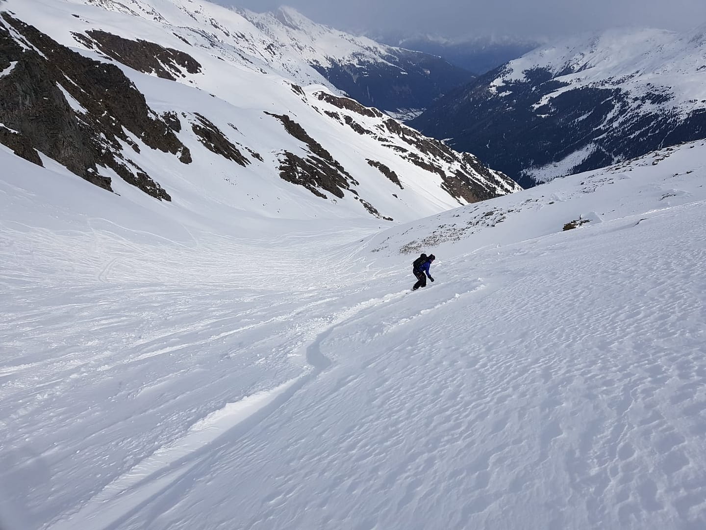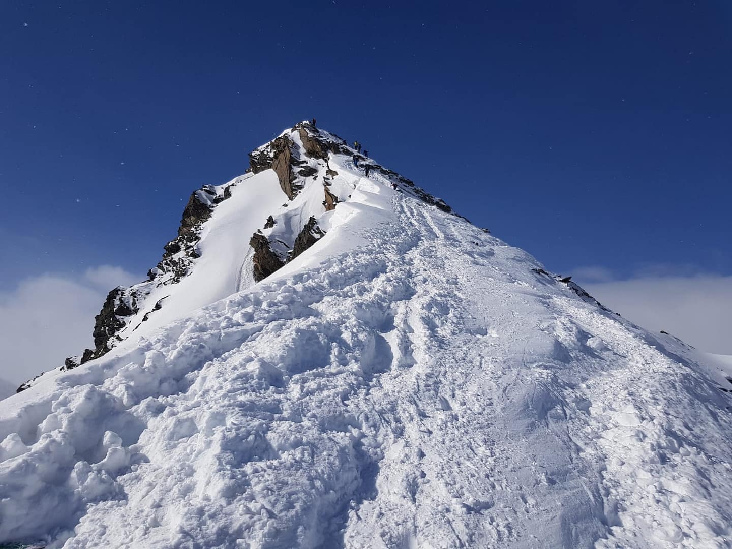 Am Talschluss steigt man in Serpentinen südöstlich der Sattelschröfen bis zu einem breiten Rücken (2.860 m) rauf, wo man das flache Stück zum Gipfelaufbau quert. Hier wird ein Skidepot gemacht, denn die letzten Meter über den Ostgrat werden zu Fuß zurück gelegt. Wir hatten Glück und mussten die Harscheisen nicht anlegen, der Grat jedoch war sehr rutschig beim Abstieg, so dass man ordentlich aufpassen musste.