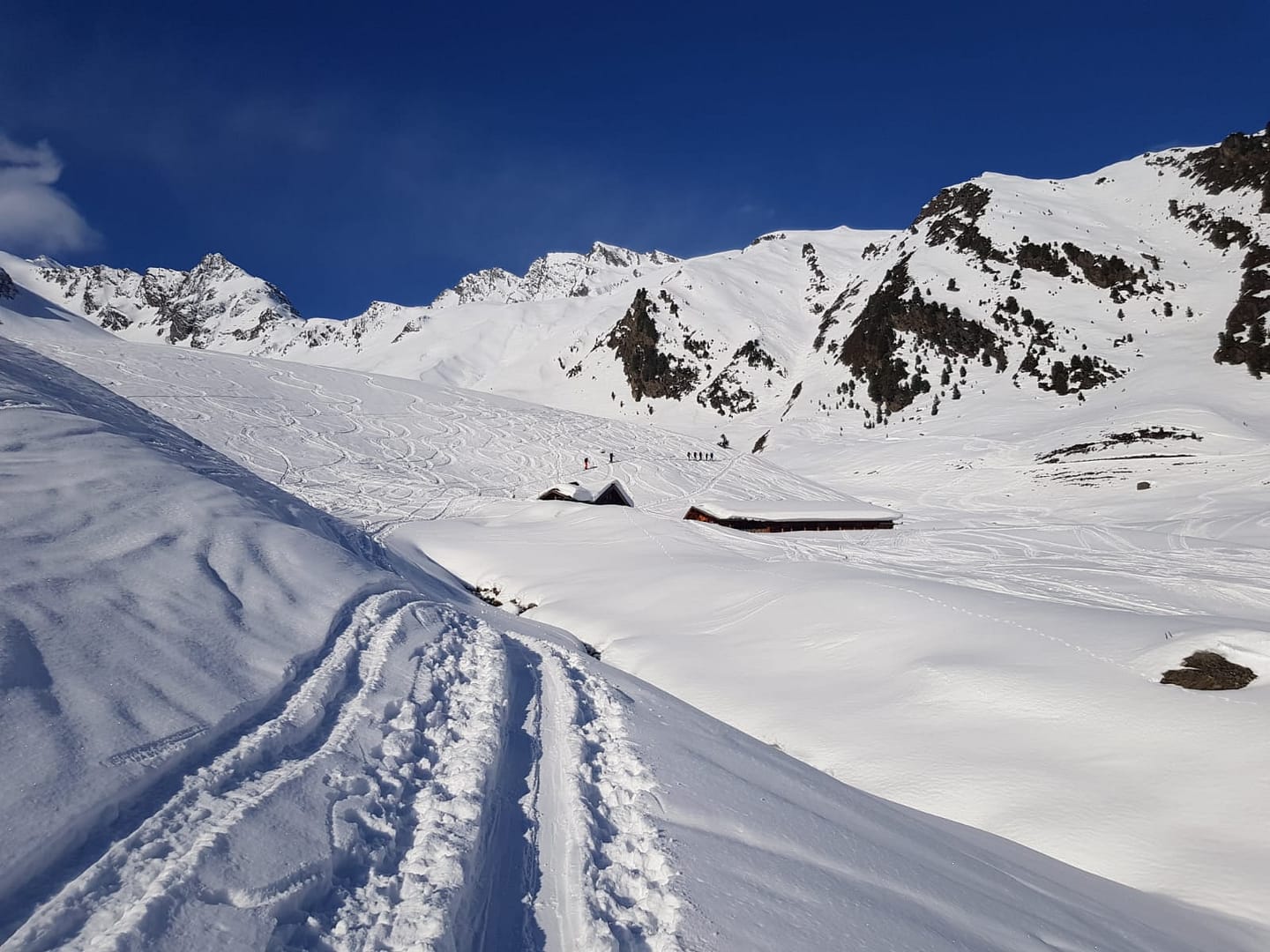8:30 Uhr standen wir am bereits halb gefüllten Parkplatz, haben unsere Splitboards angeschnallt und sind Richtung Zischgeles aufgebrochen. Zuerst folgt man dem Fahrweg vorbei am „Pieps Check Point“ und hält sich bei der Wegverzweigung links (dort stehen auch Wanderschilder, um den Weg zu weisen). Der erste Steilhang führt über eine alte Skipiste hinauf und weiter über stufiges Gelände bis zum Talschluss.