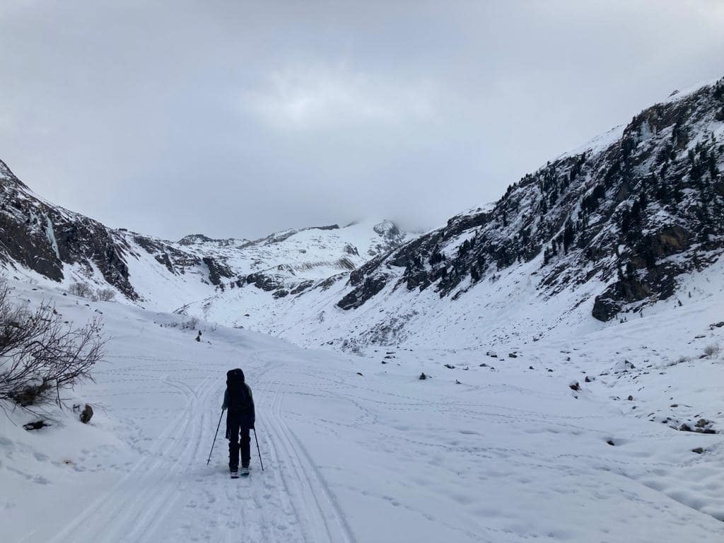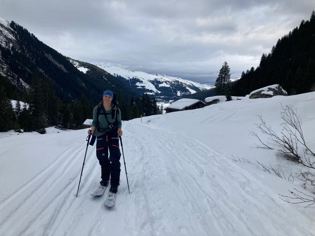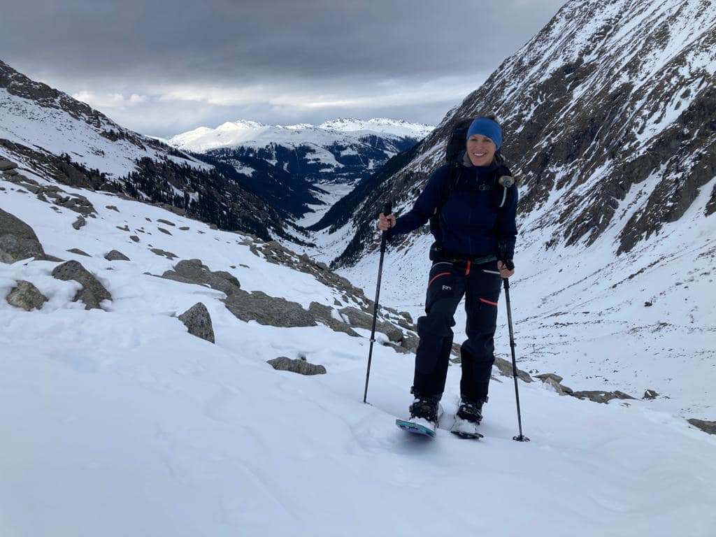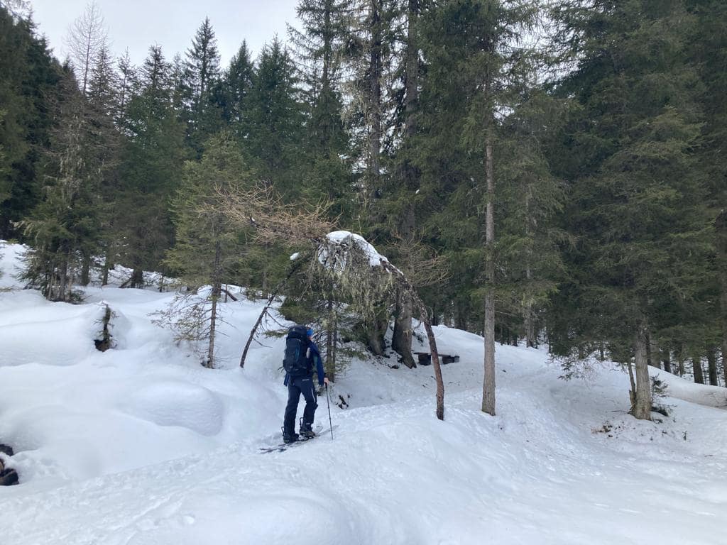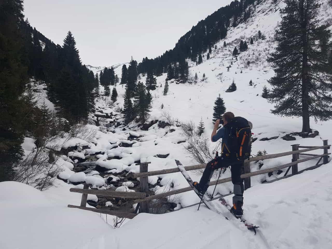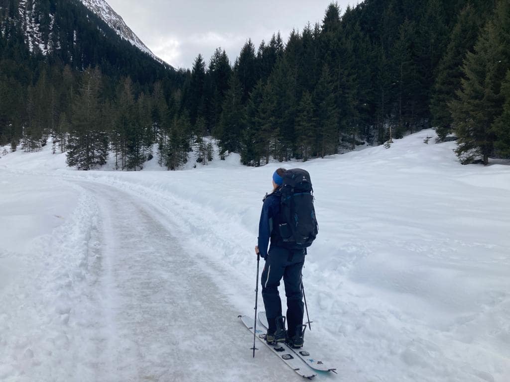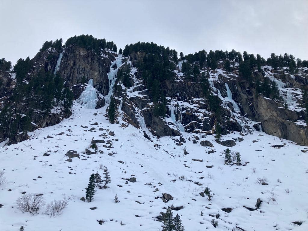 Von dem Alpengasthaus Finkau folgen wir die ersten Meter über die noch sehr leicht beschneite/eisige Straße bis zum Eingang der Leitenkammerklamm. Wir haben uns für den Weg durch den Wald entschieden, da dieser mehr Tourenfeeling hervorgerufen hat. Alternativ kann man auch weiter über die Straße weiter hoch laufen. Auf 1.584 m erreichen wir die Trissl Alm, der Weg ist sehr breit und leicht ansteigend. Rechts und links kann man geforene Wasserfälle an den Felsen bestaunen. Es geht weiter bis zum Talschluss des Wildgerlostales.