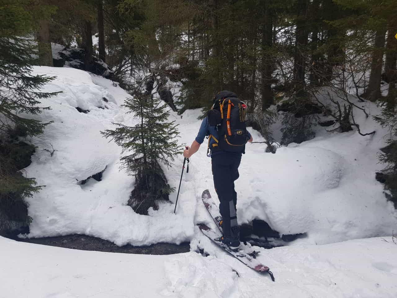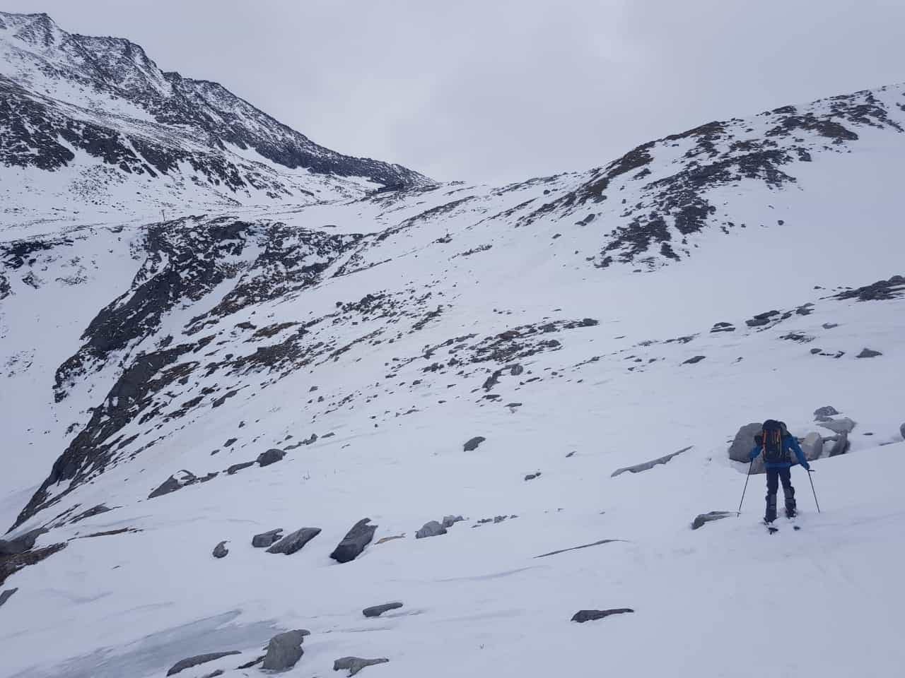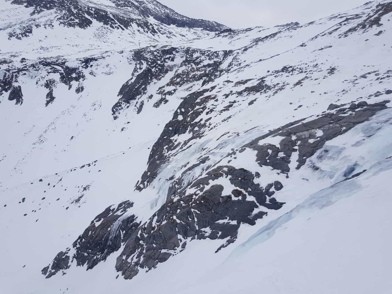 Am Ende des Tales erreichen wir die Talstation der Materialseilbahn, von hier geht es über eine Steilstufe zum Gletscherblick rauf. Die Stufe sah eisiger aus, als es schlussendlich war, aber trotzdem schon sehr verblasen und schneearm. Die Hütte ist bereits in Sichtweite.