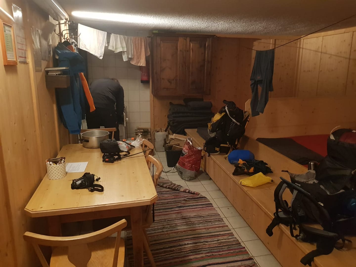 Der Winterraum der Zittauer Hütte ist gut ausgestattet: Töpfe, Teller, Besteck ist alles vorhanden, sogar Handtücher gibt es zum Abtrocknen des Geschirrs nach dem Spülen. Das Holz für den Ofen kann man im alten Schuppen der Materialseilbahn holen bzw. auch kleiner hacken, wenn es zu groß ist. Dort ist auch die Toilette. Das Lager ist gemühtlich für acht Personen zum schlafen, mit mehr wird es schön kuschelig. Da das Fenster tief eingeschneit war und so kein Tageslicht rein kam, waren wir um das Licht froh, welches immer für ca. 15 Minuten an blieb. Mitgebrachte Kerzen haben dann den Rest gemacht. 🙂