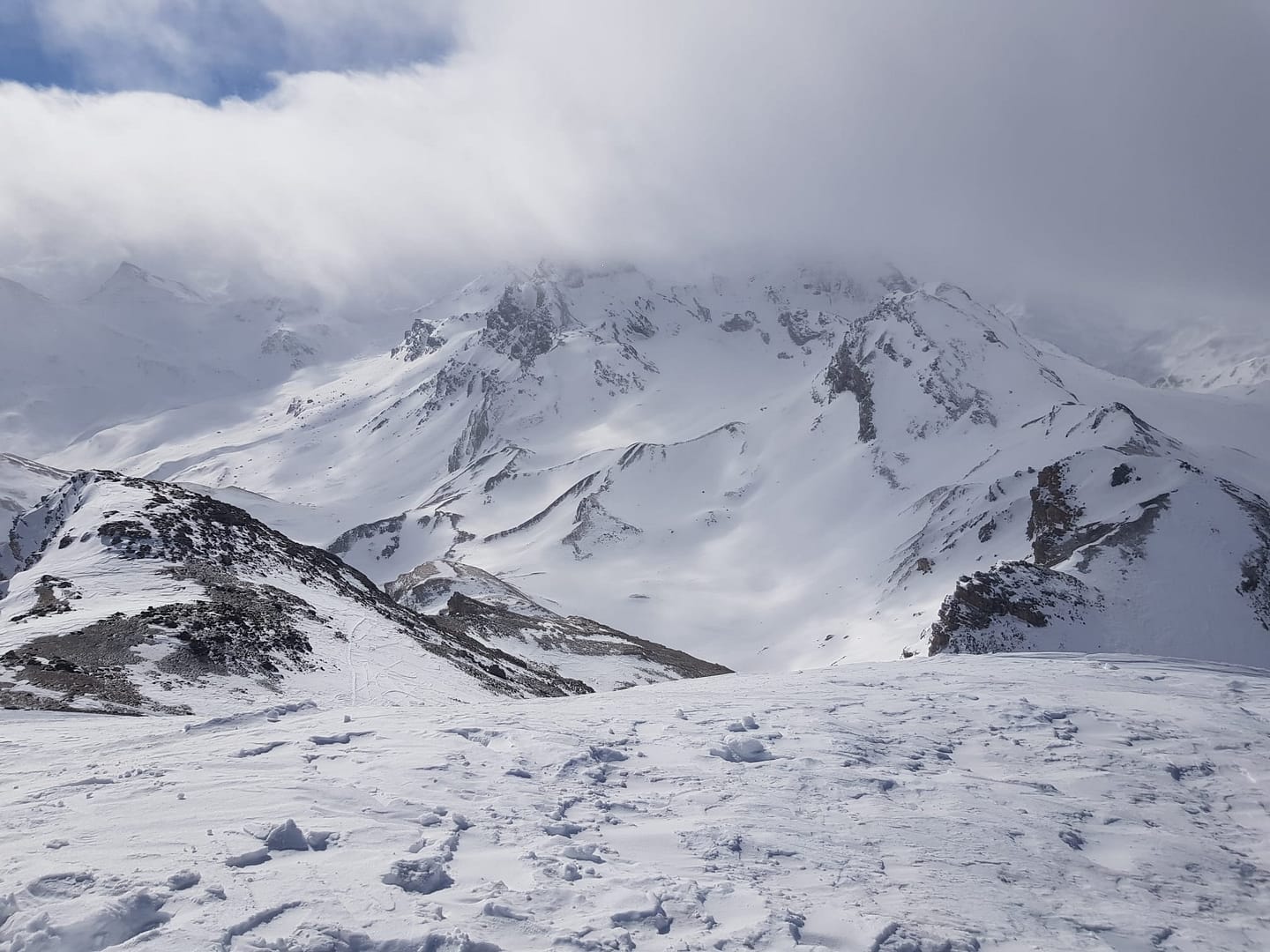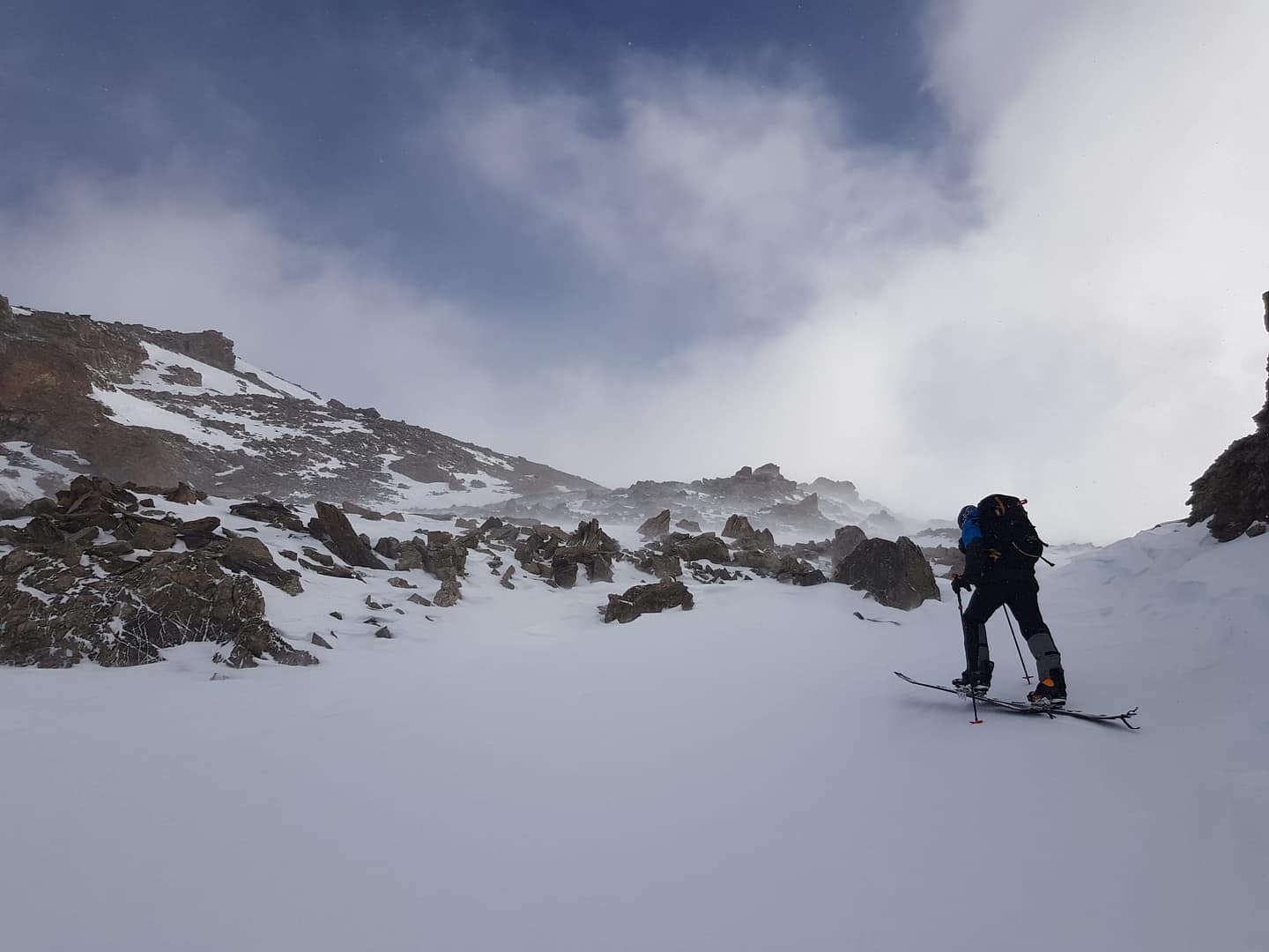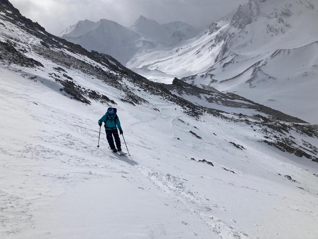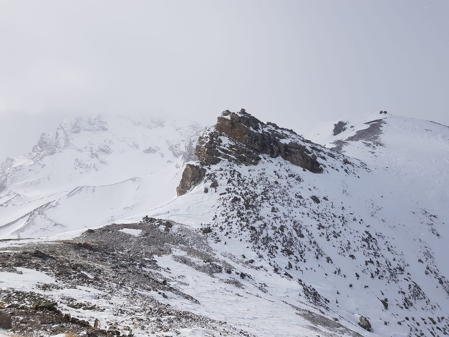 Auf ca. 2.600 m umrunden wir den Gipfel, denn man besteigt ihn von Süd-Westen aus. Es wäre an dieser Stelle leichter gewesen direkt die Scharte anzusteuern, wir sind leider etwas zu hoch gelaufen. Der Wind fegte uns um die Ohren und hat teilweise den Berg abgeblasen, so dass wir auf dem steilen, eisigen Stück Harscheisen anlegen mussten. Auch Steine und Fels kreuzten unseren Weg, aber nach knapp 900 Meter auf 2.700 m sind wir dann auf den Sommerweg gestoßen.