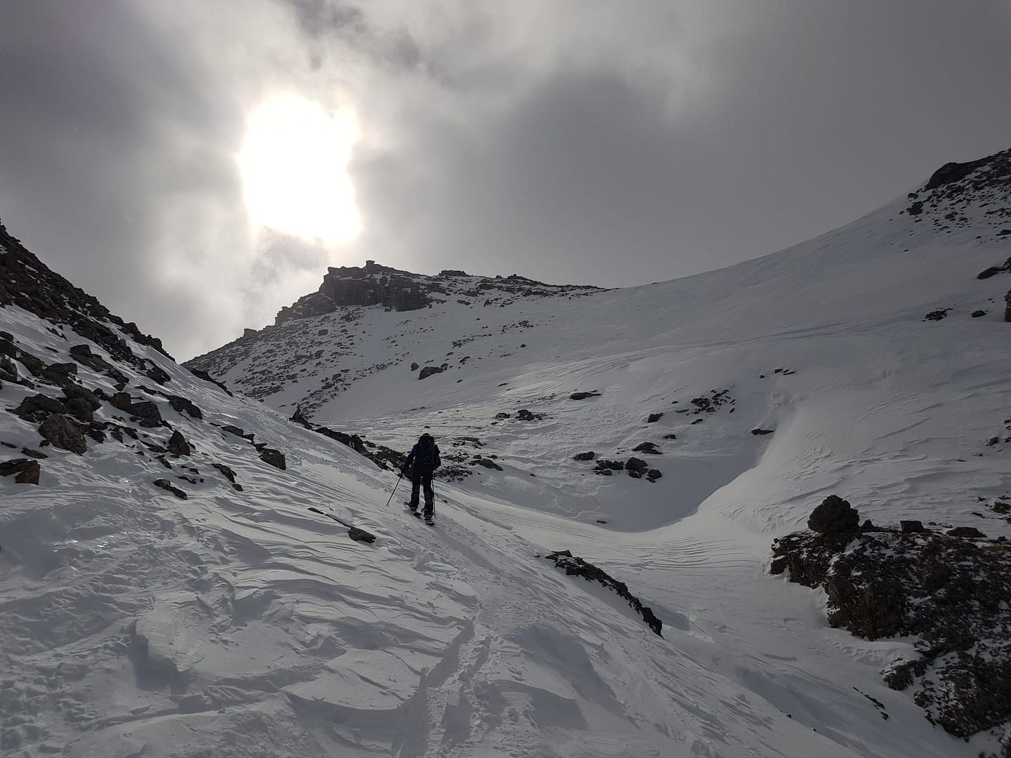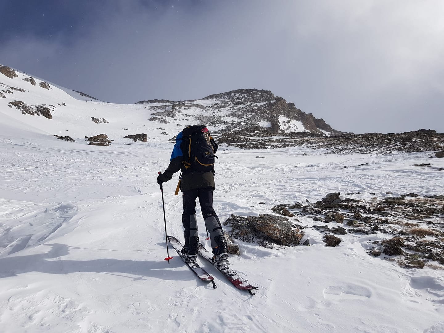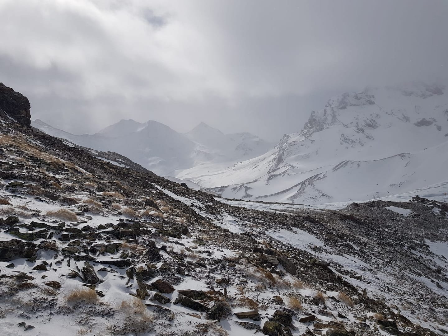 Auf ca. 2.600 m umrunden wir den Gipfel, denn man besteigt ihn von Süd-Westen aus. Es wäre an dieser Stelle leichter gewesen direkt die Scharte anzusteuern, wir sind leider etwas zu hoch gelaufen. Der Wind fegte uns um die Ohren und hat teilweise den Berg abgeblasen, so dass wir auf dem steilen, eisigen Stück Harscheisen anlegen mussten. Auch Steine und Fels kreuzten unseren Weg, aber nach knapp 900 Meter auf 2.700 m sind wir dann auf den Sommerweg gestoßen.