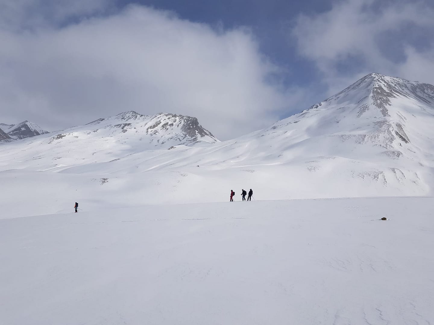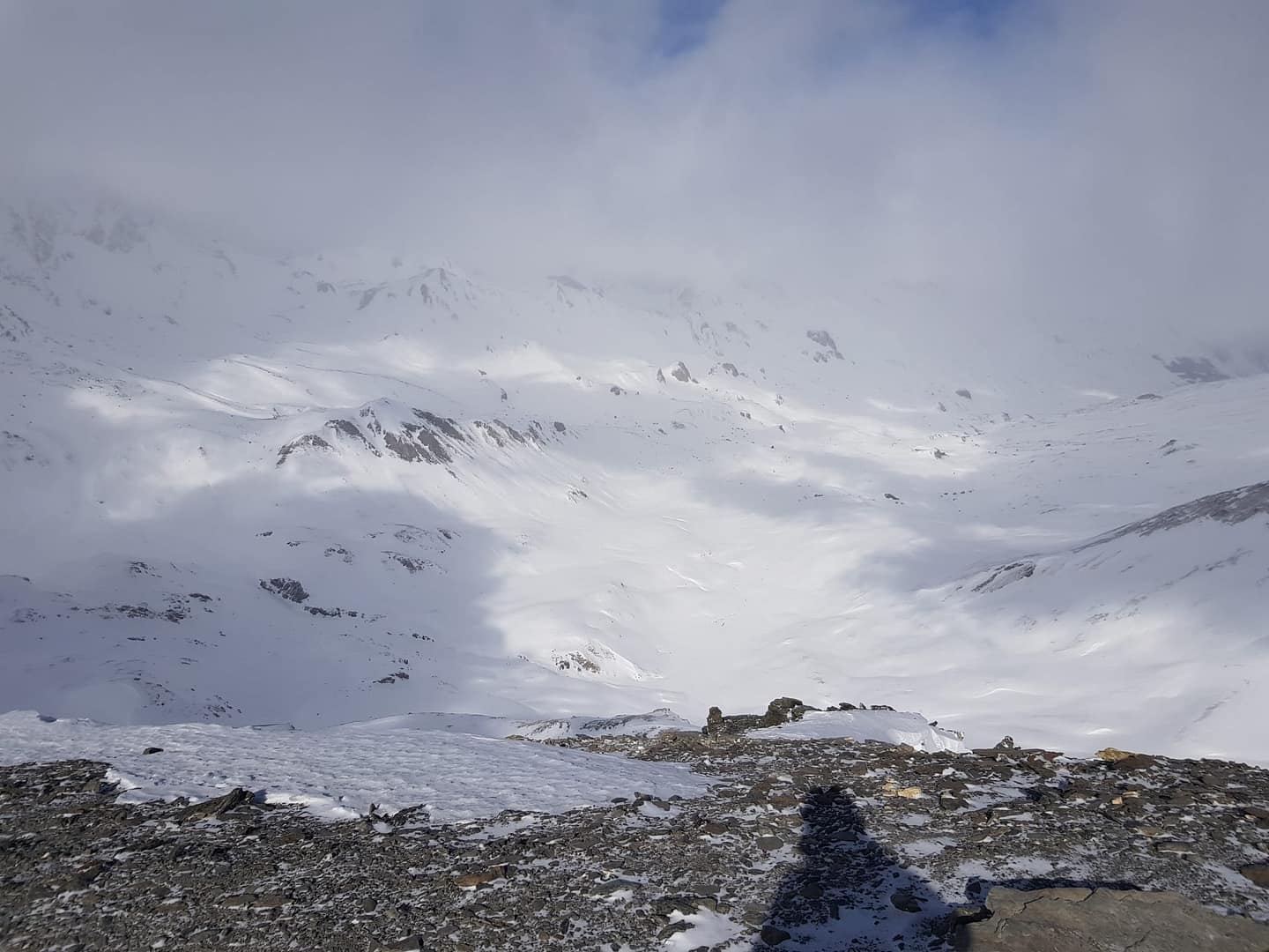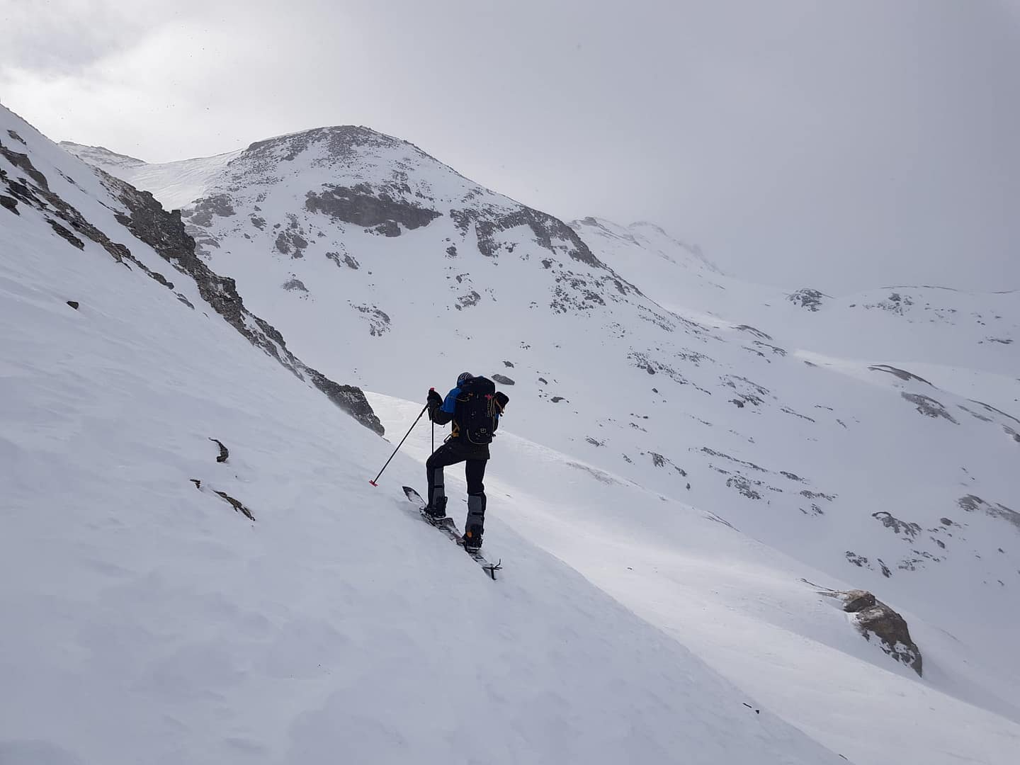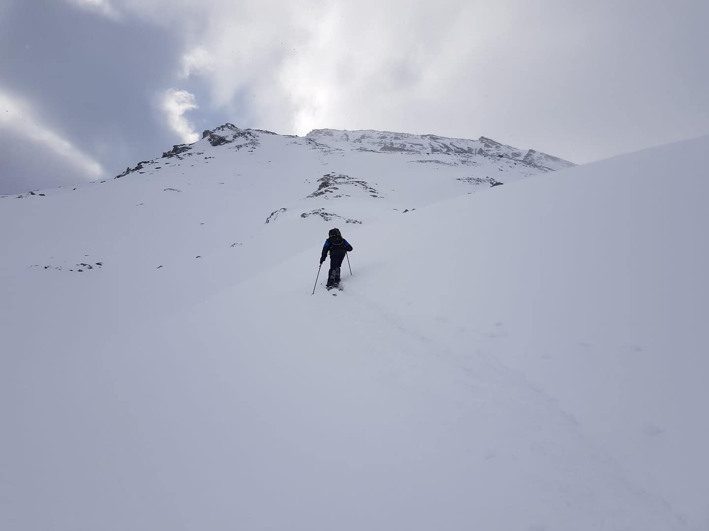 Auf ca. 2.600 m umrunden wir den Gipfel, denn man besteigt ihn von Süd-Westen aus. Es wäre an dieser Stelle leichter gewesen direkt die Scharte anzusteuern, wir sind leider etwas zu hoch gelaufen. Der Wind fegte uns um die Ohren und hat teilweise den Berg abgeblasen, so dass wir auf dem steilen, eisigen Stück Harscheisen anlegen mussten. Auch Steine und Fels kreuzten unseren Weg, aber nach knapp 900 Meter auf 2.700 m sind wir dann auf den Sommerweg gestoßen.