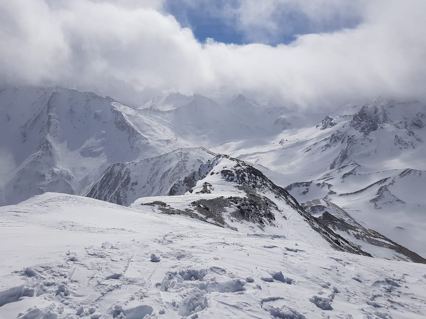 Durch eine felsdurchsetzte, abgeblasene Rinne ging es die letzten Meter hoch zum Gipfel. Oben angekommen genossen wir die kurzen Augenblicke auf die Gipfel rundherum.