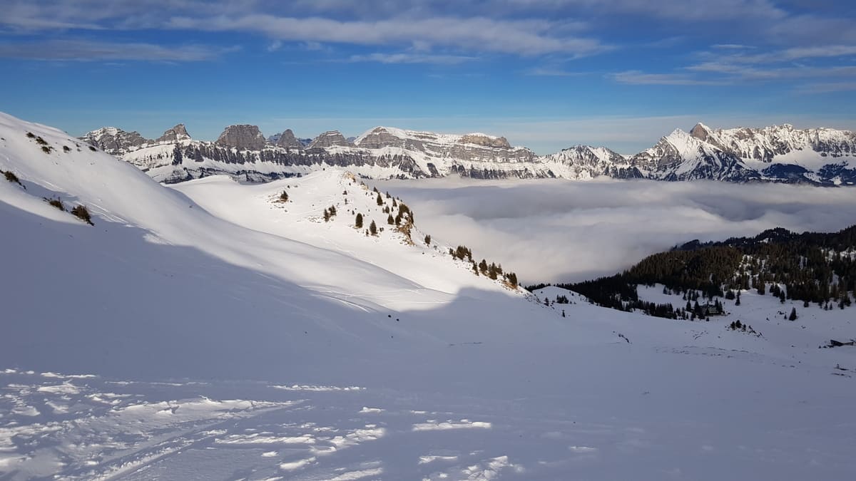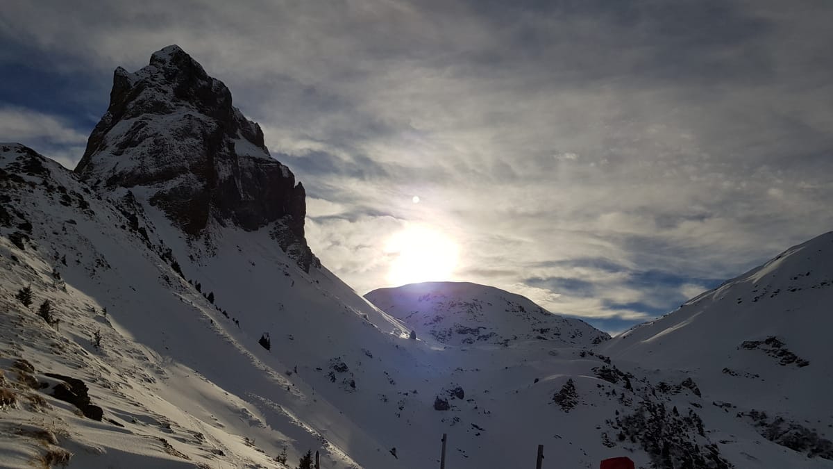 Dieser etwas chaotische Tour beginnt in Tannenboden am Lift Maschgenkamm. Wir haben ein Ticket bis zum Leist sowie Retour gezahlt, das waren ca. 40 Euro pro Person. Mit der Gondel sind wir bis zur Bergstation Maschgenkamm hochgefahren. Dann ging es die Piste zur Grübhütte runter zum nächsten Lift bis auf den Leist rauf. Erst ab hier begann unsere eigentliche Skitour. Abwendend von der Piste zog es uns ins weite Tal hinauf. Direkt der erste Teil der Tour war eine Tortur für mich als Snowboarder, der Hang war der steil und komplett vereist. Diese Hürde überwunden fellten wir unsere Skier /Boards auf (4. Bild). Der Ausblick war atemberaubend und traumhaft schön.