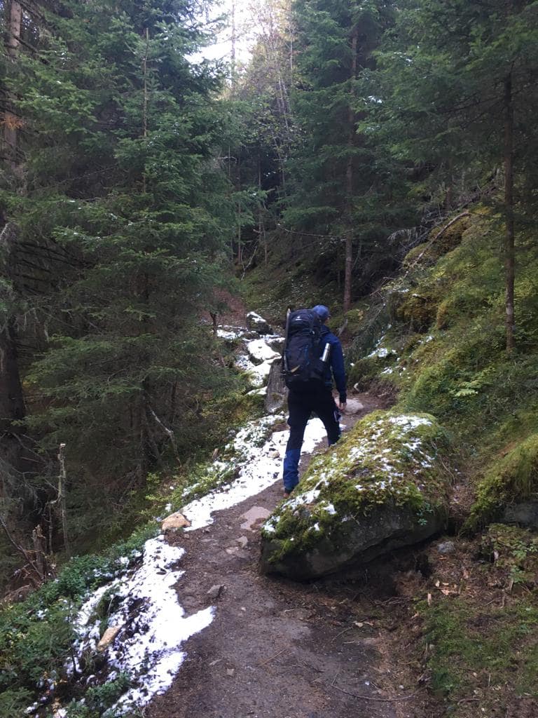 Vom Parkplatz geht es leicht ansteigend über einer Fahrstraße los. Nach ca. 1,3 km führt der Weg über den Fischbach über eine Brücke, nach welcher man links durch den Wald über einen steileren Pfad den Weg leicht abkürzen kann. Oben aus dem Waldstück wieder raus, geht es weiter auf der Fahrstraße Richtung Sulztalalm, welche wir nach 3,6 km erreichen. Weiter geht es an der Hinteren Sulztalalm vorbei und etwas steiler schlussendlich zu Amberger Hütte.