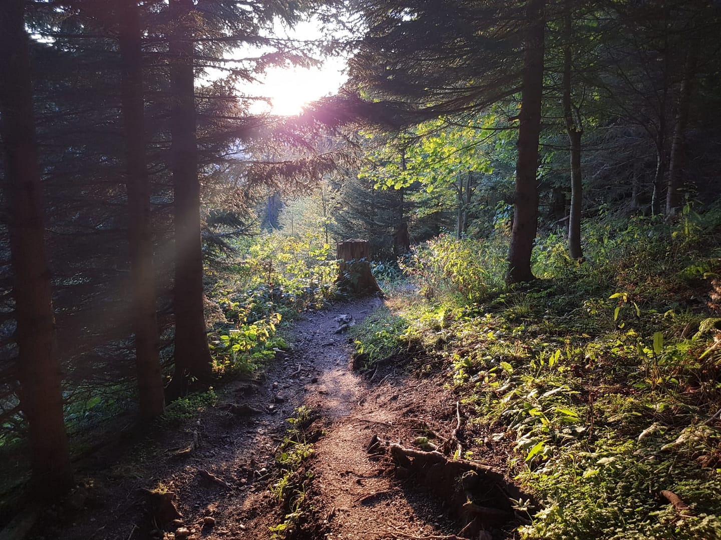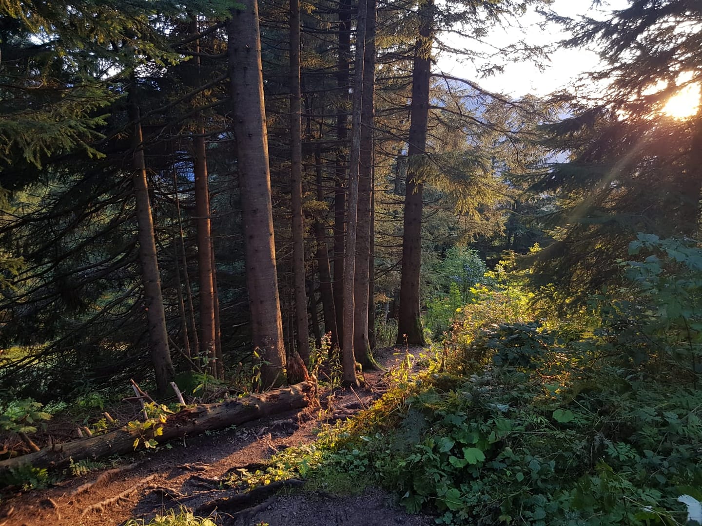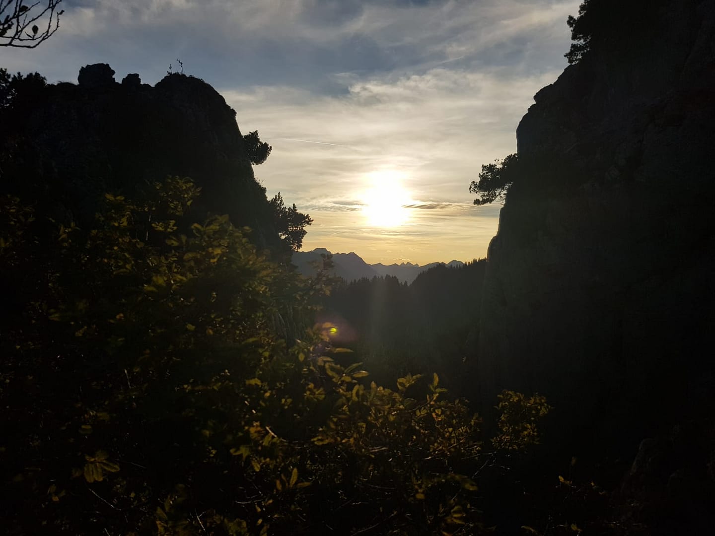 Da der Pfad im Wald bereits im Aufstieg recht dunkel war, habe ich den kompletten Sonnenuntergang nicht abgewartet, sondern bin bereits früher vom Gipfel runter – zum Glück, denn so konnte ich die schönen Sonnenstrahlen, die durch die Bäume fielen einfangen. Tolle Feierabendtour!