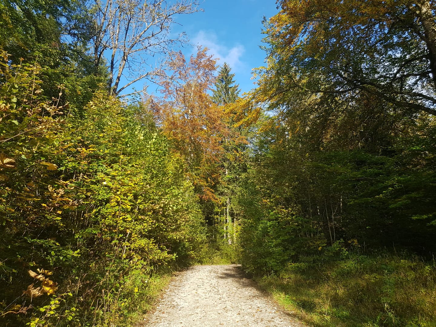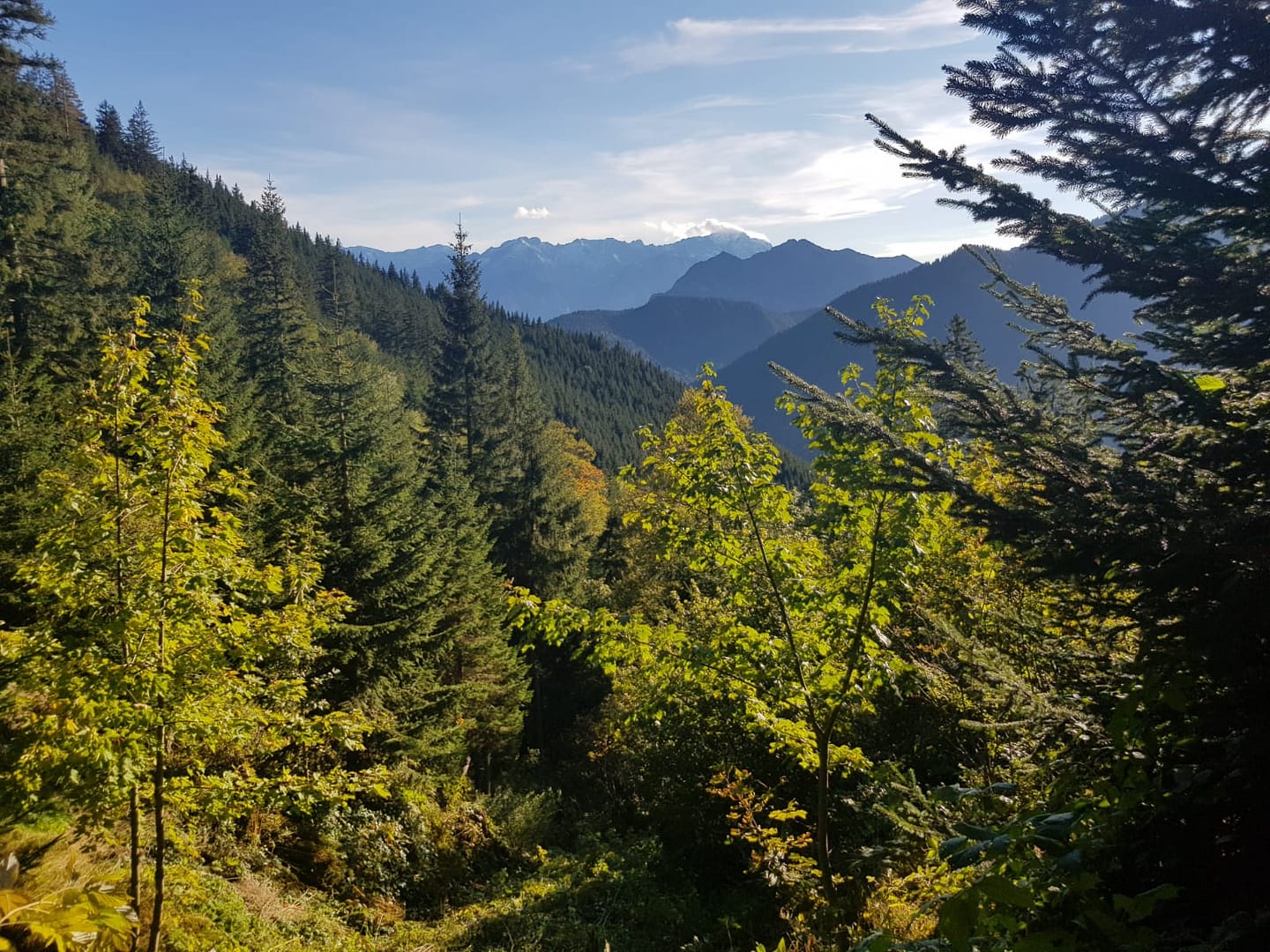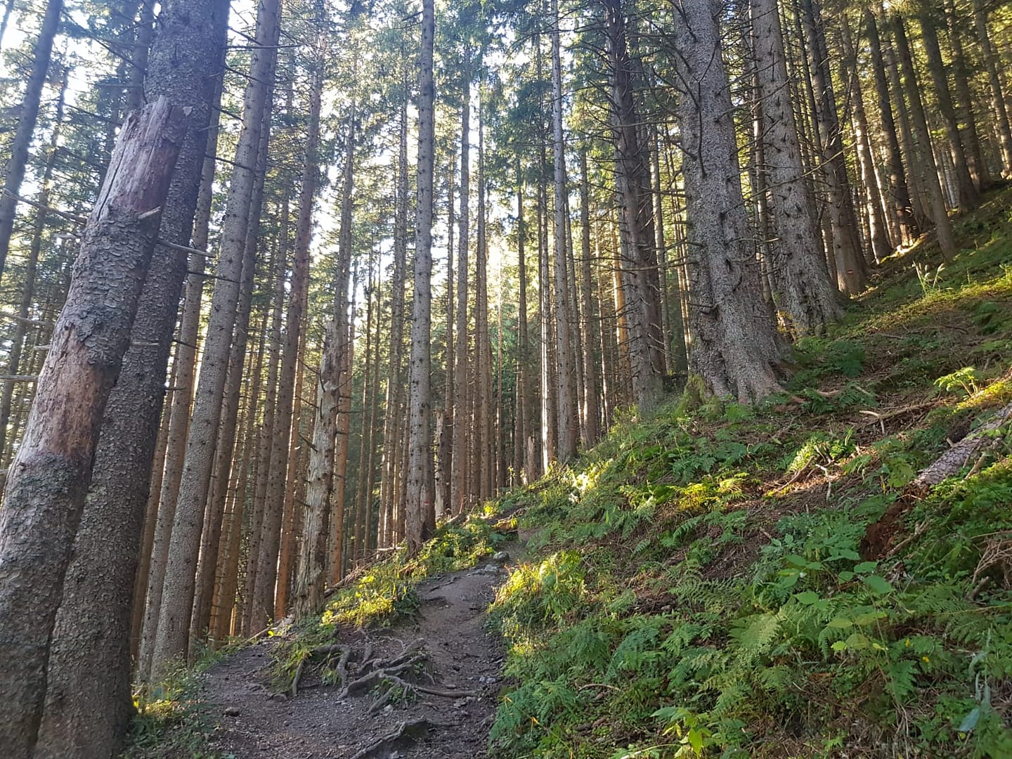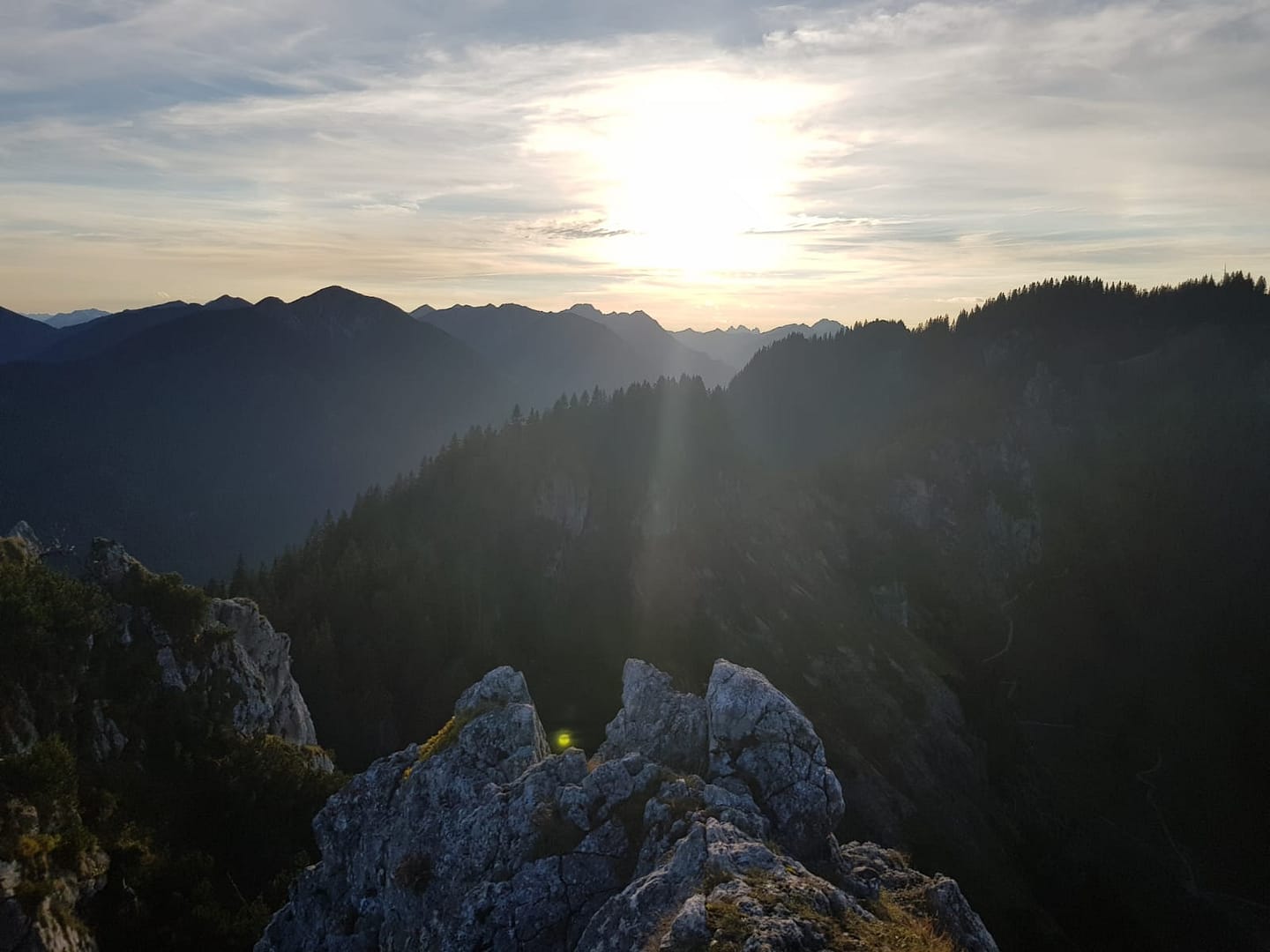 Da der Pfad im Wald bereits im Aufstieg recht dunkel war, habe ich den kompletten Sonnenuntergang nicht abgewartet, sondern bin bereits früher vom Gipfel runter – zum Glück, denn so konnte ich die schönen Sonnenstrahlen, die durch die Bäume fielen einfangen. Tolle Feierabendtour!