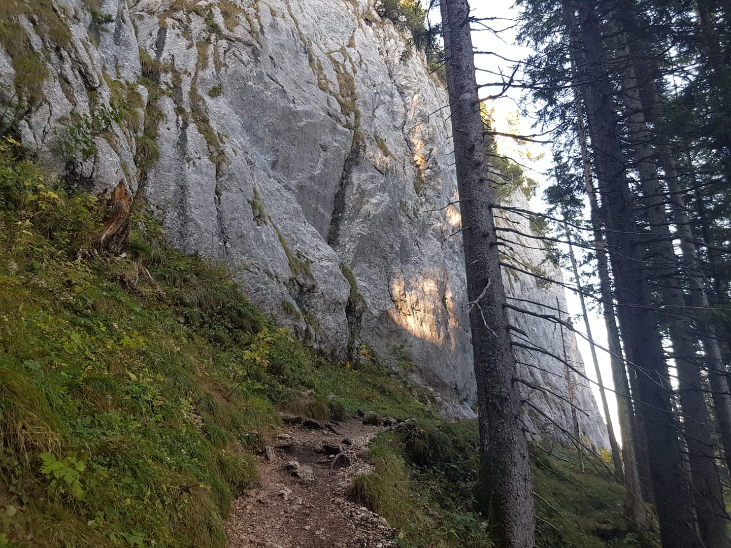 Der Weg führt erst auf einem breiten Weg durch den Wald, wo mehrere Bachläufe kreuzen. Nach kurzer Zeit wird der Weg etwas schmaler und schlängelt sich in Serpentinen und teilweise in steilen Stufen weiter hoch bis zu dem Felsenaufbau des Gipfels Ettaler Manndl.