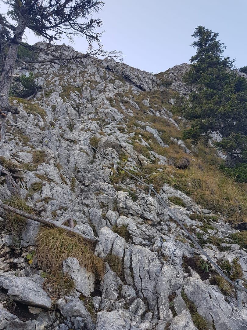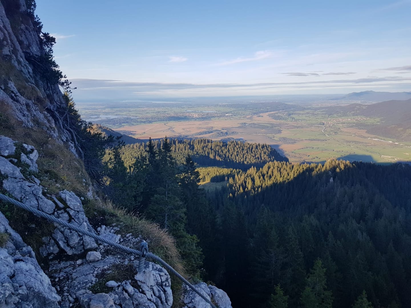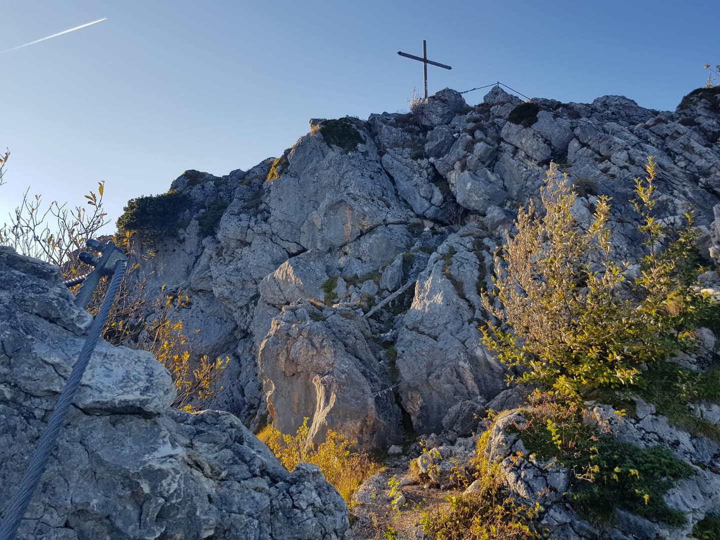 Den Gipfelaufbau umrundet startet die Kletterpassage (auch A/B Klettersteig), welche mit einem Stahlseil gesichert ist. Ich hatte kein Klettersteigset dabei und habe mich an der Kraxelei erfreut. Bereits nach wenigen Minuten sieht man das Gipfelkreuz vom Ettaler Manndl und hat von oben einen tollen 360° Ausblick. Direkt gegenüber ist die Bergstation vom Laber.