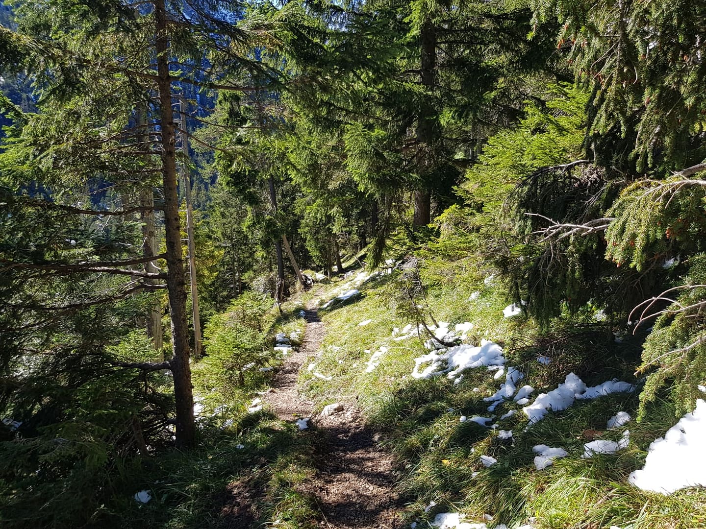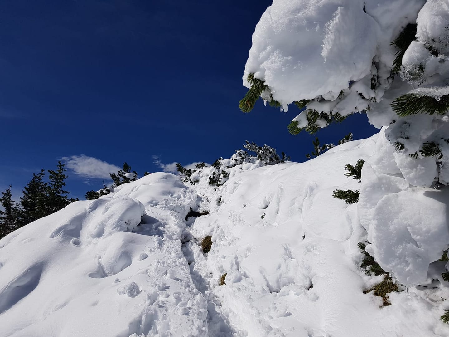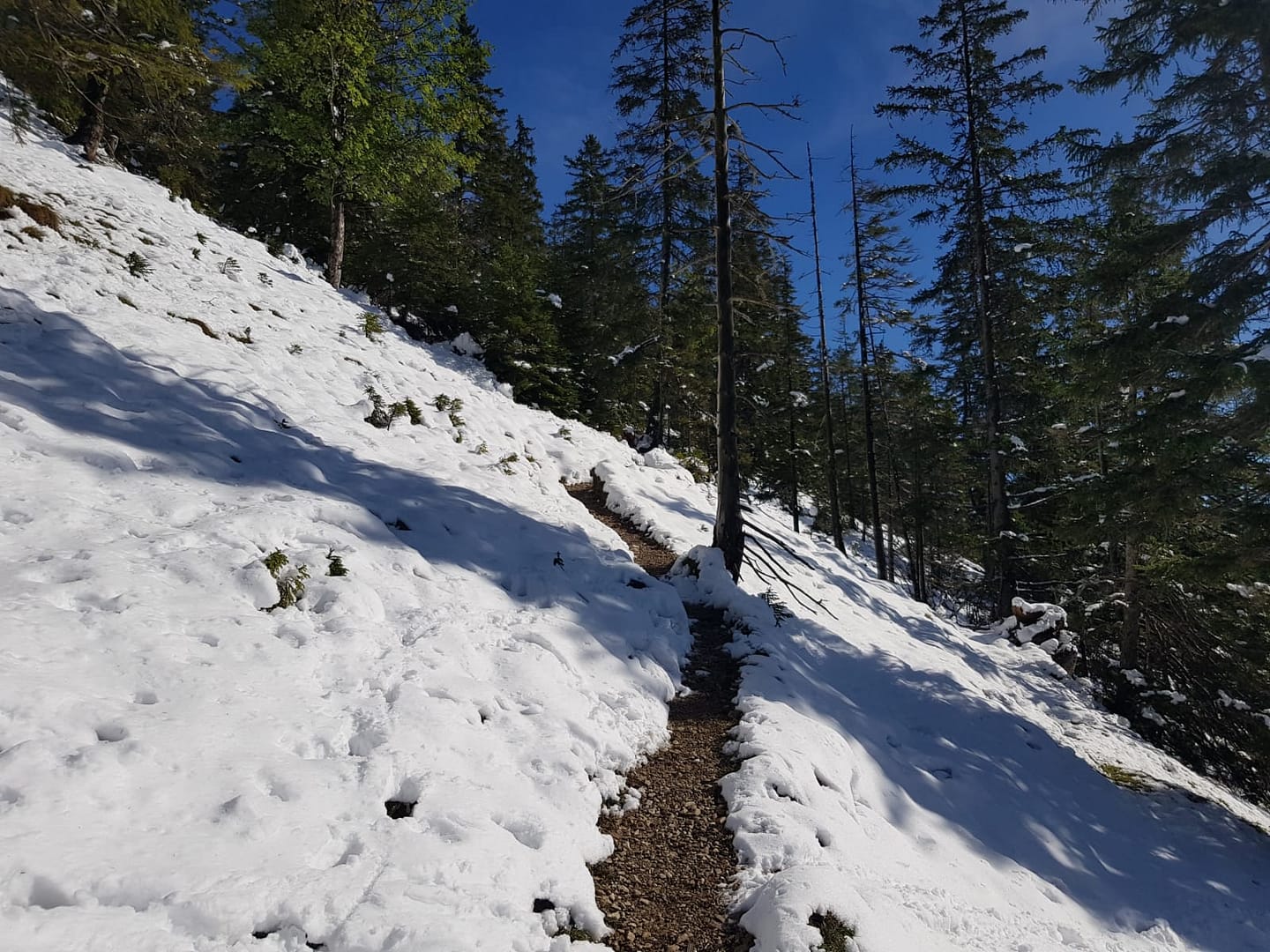 Da es sehr windig war, haben wir nur eine kurze Pause eingelegt und sind dann den Grat weiter bis zum Sattel zwischen Fricken und Bischof gefolgt. Der eigentliche Plan war, dass wir den nächsten Gipfel den Bischof noch mitnehmen, aber aufgrund der Schneegrundlage, welche doch im laufe des Tages recht matschig wurde, haben wir uns dann dagegen entschieden. Ab dem Sattel folgten wir den Weg an der Flanke des Hohen Frickens zurück, bis wir wieder auf den Aufstiegssteig kreuzten. Ab hier geht e entlang der Aufstiegsroute zurück ins Tal.