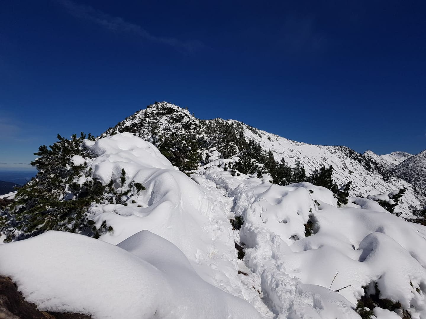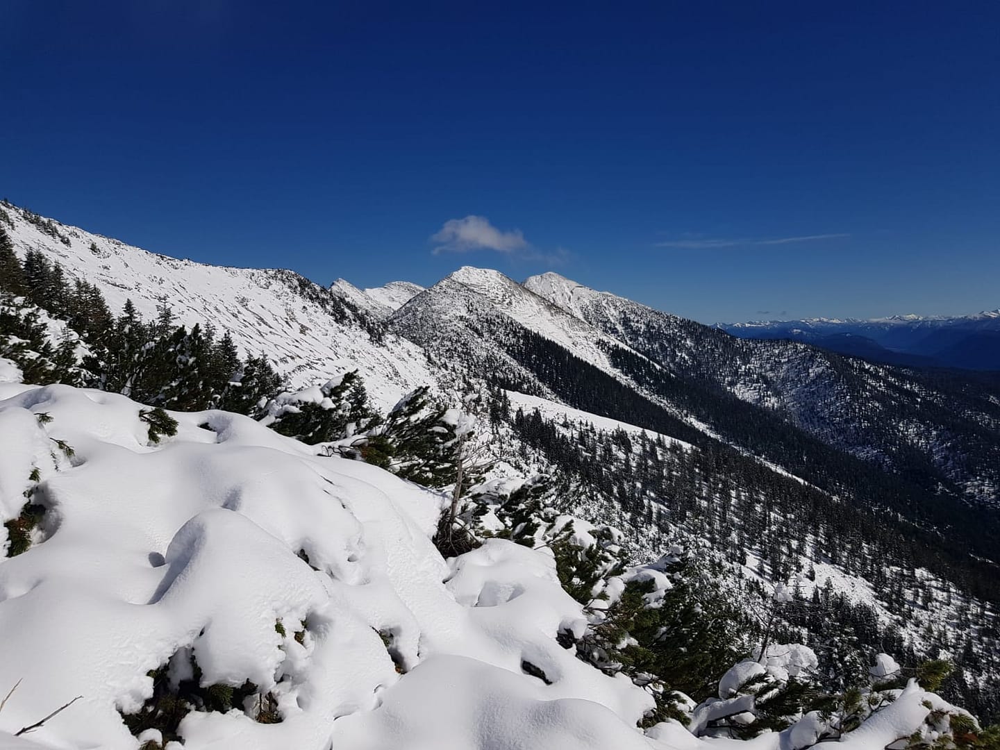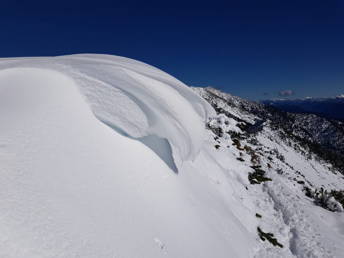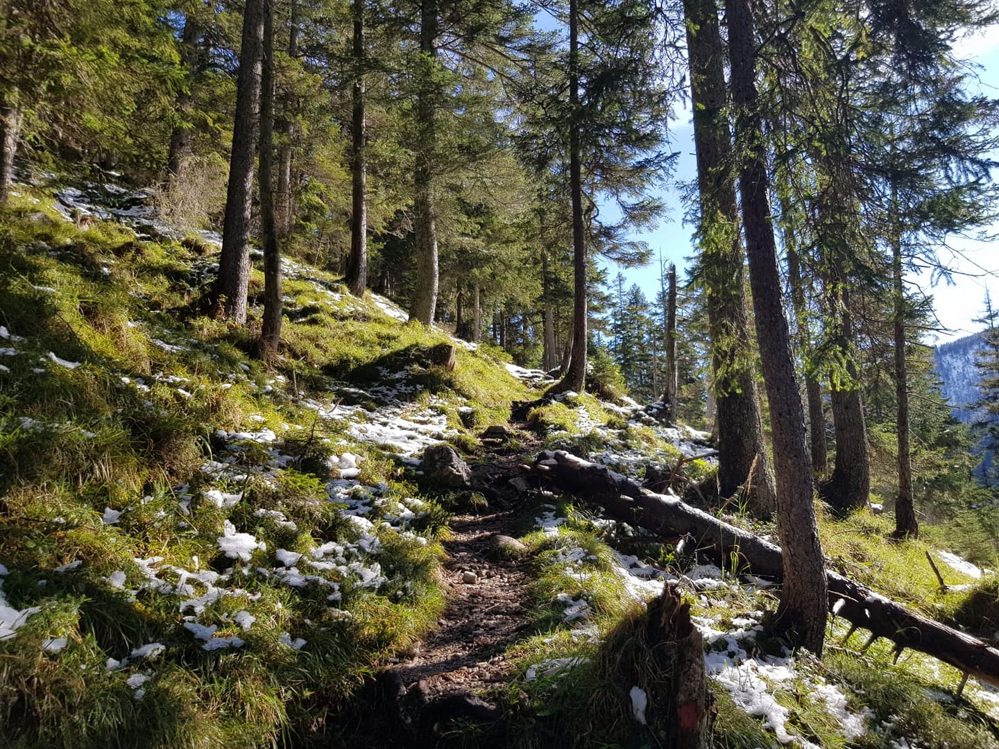 Da es sehr windig war, haben wir nur eine kurze Pause eingelegt und sind dann den Grat weiter bis zum Sattel zwischen Fricken und Bischof gefolgt. Der eigentliche Plan war, dass wir den nächsten Gipfel den Bischof noch mitnehmen, aber aufgrund der Schneegrundlage, welche doch im laufe des Tages recht matschig wurde, haben wir uns dann dagegen entschieden. Ab dem Sattel folgten wir den Weg an der Flanke des Hohen Frickens zurück, bis wir wieder auf den Aufstiegssteig kreuzten. Ab hier geht e entlang der Aufstiegsroute zurück ins Tal.