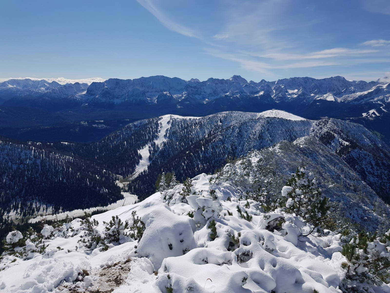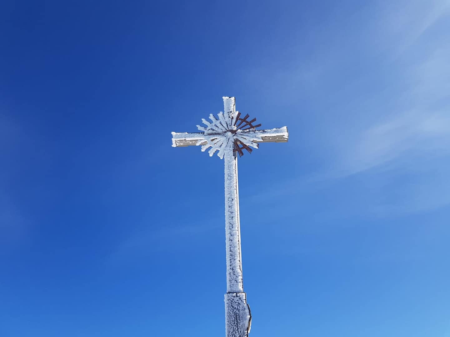 Vom Wanderparkplatz folgen wir den Schildern zum Hohen Fricken. Der Weg führt nicht über die Kuhflucht Wasserfälle (Abzweig 1. Bild), sondern rechts haltend weiter hoch. Ein paar steile und schmale Serpentinen führen vorbei an dem markanten Radhaus (2. Bild) , welches den Weg säumt. Der Pfad führt weiter bis zu einer sehr breiten, steilen Fahrstraße. Sobald es flacher wird queren wir wenig später ein Weiderost und finden ein paar Meter weiter einen ca. 3m hohen Stein, den sogenannten „Predigtstuhl“, wo der Steig nach links zum Gipfel führt (3. Bild). Im späten September wurden wir bereits mit viel Schnee beschwert, der die Wanderung zu dieser Jahreszeit zu etwas besonderem macht. Wir schlagen den direkten Weg zum Gipfel ein, wo uns ein toller 360° Ausblick erwartet.